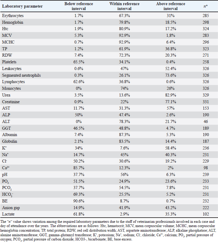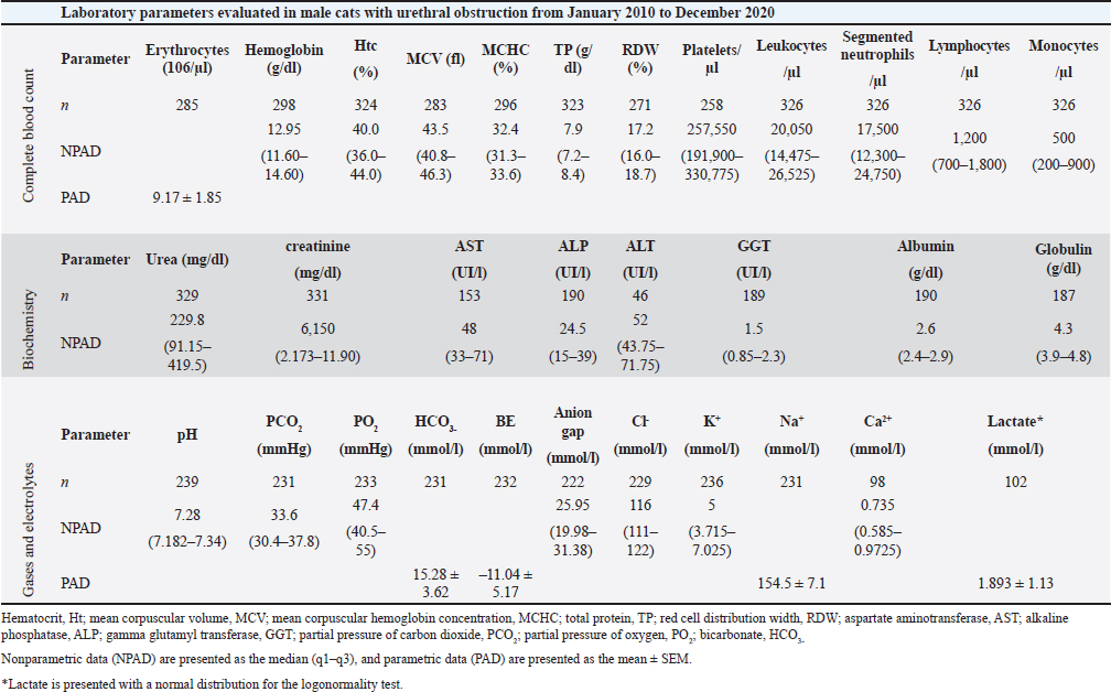 AbstractBackground: Urinary retention in obstructed male cats leads to changes in blood and urine compounds, which, combined with the time of obstruction, are linked to the worsening of the animal’s clinical status. Aim: This study aimed to describe the primary laboratory changes in male cats with urethral obstruction (UO). Methods: Medical records of 386 male cats diagnosed with UO and treated at the Veterinary Teaching Hospital of the Faculty of Veterinary Medicine and Zootechnics (FMVZ), UNESP—Botucatu, between 2010 and 2020 were reviewed. Data on sex, age, breed, body weight, and reproductive status were evaluated. Results: Over the years, complete blood count, renal and hepatic biochemistry, blood gas analysis, electrolytes, urinalysis, and urine culture were performed upon request. Anaemia was not representative in obstructed cats. Thrombocytopenia was identified in 65.5% (169/258) of patients, and neutrophilic leukocytosis was identified in 52.4% (170/326) of patients. High urea and creatinine values were detected in 82.9% (273/329) and 77.1% (256/331) of the patients, respectively. Acidemia, increased PO2, metabolic acidosis, hypochloremia, hyperkalemia, hypernatremia, and hypocalcemia were observed in 37.6% (90/239), 51.5% (120/233), 69.3% (160/231), 50.2% (115/229), 58.5% (138/239), 40.2% (93/231), and 85.7% (84/98) of the cats, respectively. Urinalysis revealed an acidic pH, isosthenuria, a low proportion of proteins, and a high presence of occult blood and erythrocytes per field (> 1,000). Finally, 19.49% had positive cultures. Escherichia coli and Staphylococcus spp. are commonly isolated. Conclusion: This study provides a description of laboratory changes and those most prevalent in the population under study. UO may result mainly in isolated or combined laboratory changes such as azotemia, acidemia, metabolic acidosis, hyperkalemia, hypocalcemia, acidic pH, and occult blood in the urine. Additional laboratory changes may be present; however, they must be deeply investigated as comorbidities might be associated with them. Therefore, the description of laboratory changes in large populations, such as in male cats with UO, provides a reference for veterinarians regarding the hematological and urinary changes expected in obstructed male cats and instigates the search for further studies in the field. Keywords: Blood abnormality, Felis catus, FLUTD, Urethra, Urine blockage. IntroductionUrethral obstruction (UO) in male cats is a feline lower urinary tract (FLUTD) complication commonly associated with causes such as feline idiopathic cystitis (FIC), urolithiasis, urethral plugs, neoplasms, or anatomical defects (Piyarungsri et al., 2020). Urinary retention affects the glomerular filtration rate (Muller et al., 2022), leading to the disruption of blood and urine compounds (Dinallo et al., 2022). These conditions, combined with the time of obstruction, are often linked to deterioration of the animal’s clinical condition, resulting in a poorer prognosis and a greater risk of mortality (Segev et al., 2011). The inability to excrete nitrogenous compounds such as urea and the inability to tubularly reabsorb creatinine may lead to an increase in both compounds in the blood, which may exhibit varying proportions (Abdel-Saeed et al., 2020). Among the changes in blood gas analysis and electrolytes, a significant increase in phosphorus, magnesium, lactate, potassium, and sodium levels, along with a significant reduction in blood pH and PO2, can be identified in male cats obstructed for a period of ≥ 36 hours (Neri et al., 2016). Nevertheless, a significant increase in ionized calcium levels can be expected (Segev et al., 2011). In the complete blood count (CBC), an increase in hematocrit (Htc), total leukocyte count, and absolute neutrophil count, along with a significant decrease in total lymphocyte and monocyte counts, can be expected (Abdel-Saeed et al., 2020). Notably, hypoproteinaemia can also be identified (Lamb et al., 2018). Urine retention in cats with UO can lead to hematuria, proteinuria, and crystalluria (Seo et al., 2021). Additionally, microhematuria (> 10 red blood cells (RBCs) per field) is frequently observed in cats with lower urinary tract disease due to various causes. Moreover, pyuria may be more common in cats with urinary tract infections (UTIs) than in those with FICs (Dorsch et al., 2014). Furthermore, pyuria, occult blood, and bacteriuria can also be detected (Neri et al., 2016). When bacteria and leukocytes are present in urinalysis, urine culture becomes an important diagnostic tool for urogenital infections, preferably collected through cystocentesis to reduce the risk of contamination by microbial agents from the lower genitourinary tract (Sævik et al., 2011). Australian, European, and Norwegian studies have reported Escherichia coli as the most commonly isolated microbial agent in the urine of cats with lower urinary tract disease, specifically bacterial cystitis, with the majority having an estimated abundance of > 100,000 CFU/ml of urine (Litster et al., 2007; Passmore et al., 2008; Sævik et al., 2011). Hematological evaluation in obstructed cats supports diagnosis and enables monitoring of the animal’s clinical progression (Balakrishnan and Drobatz, 2013). Unlike previous studies with both nonobstructive and obstructive FLUTD, this study provides a descriptive presentation of the hematological and urinary changes in 386 male cats with UO treated at the Veterinary Hospital of São Paulo State University in Botucatu, Brazil, from 2010 to 2020. Materials and MethodsData collectionMedical records of male and female cats attending the Veterinary Teaching Hospital of the FMVZ, UNESP—Botucatu, were accessed and carefully reviewed from January 2010 to December 2020 for the selection of male cats diagnosed with UO presenting signs of the lower urinary tract (urine retention, hematuria, stranguria, pollakiuria, periuria, and dysuria). Data on CBC, rena