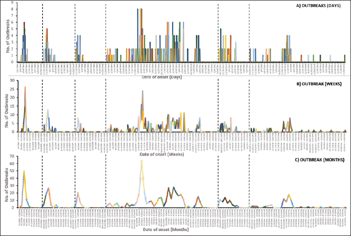 Fig. 1. Epidemic curves of outbreaks of highly pathogenic avian influenza subtype H5N1 in Menofia governorate from January 2006 to December 2016, illustrating A) daily, B) weekly, and C) monthly frequency of outbreaks as a function of time. Vertical lines delineate the six EWs. Table 1. Number of outbreaks during each of the six EWs in each city in Menofia governorate.