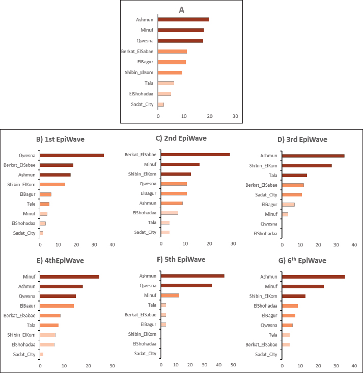 Fig. 2. (A) Spatial Distribution of HPAI H5N1 outbreaks in Menofia governorate in the period from 2006 to 2016 (B, C, D, E, F, and G are representing the six epidemic waves). Vertical axis represents the cities, while horizontal axis represents the total no. of outbreaks.