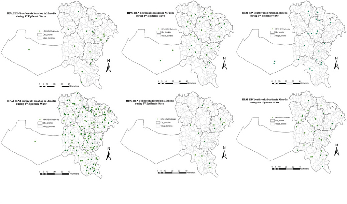 where: SD is the standard distance Dm is the median distance n is the number of points if no population field is used, or if a population field is supplied, n is the sum of the population field values. Kernel density maps for the total number of cases were plotted for each EW to visualize the risk for the disease. Default cells and the output were selected in Square kilometers (Km2). Clustering, defined as an aggregation of diseases within specific spatial and temporal dimensions beyond what could be anticipated, is a fundamental concept in epidemiological analysis (Porta, 2014). Retrospective space-time permutation scan statistics were performed to detect the Spatio-temporal clusters for each EW by investigating whether the outbreaks were interrelated in space and time using (SaTScan 8.2.1 software) (Kulldorff et al. 2005; Onozuka and Hagihara, 2008; Kulldorff, 2010). The scanning window was a cylinder with the spatial and temporal dimensions as circular base and height, respectively. The temporal scanning window was set to <50% of the study period in each EW and a maximum of 50% of outbreaks were allowed in the spatial scanning window (Zhang et al., 2012). The likelihood ratio statistic was used to evaluate the possibility of a true spatiotemporal cluster in a window. The window with the maximum likelihood ratio statistic was considered the primary cluster while the remainder was considered the secondary cluster. Their statistical significance was tested through Monte Carlo simulations of 999 replications (Zhang et al., 2012). The time units of day, week, and month were used, respectively. ArcGIS 10.5 software was used to overlay results from different methods in a map for visual comparisons (ESRI, Redlands). Ethical approvalNot needed for this study. ResultsTemporal distribution of HPAI H5N1 outbreaks in Menofia governorate, EgyptThroughout the study period encompassing 2006 to 2017, six distinct epidemic waves (EW1-6) of H5N1 outbreaks were discerned, as illustrated in Figure 1. The first epidemic wave (first EW) commenced in February 2006, persisted for approximately 3 months, and encompassed 66 reported outbreaks. This initial wave reached its peak in mid-March 2006, subsequently abating in May 2006. The second epidemic wave (second EW) unfolded on November 21, 2006, and exhibited its peak in December of the same year, culminating in mid-April 2007. Notably, this wave spanned 4 months and comprised an estimated 57 outbreaks. Progressing to the third epidemic wave (third EW), the Menofia governorate encountered 30 outbreaks, spanning the duration of three months from December 2, 2007, to mid-March, 2008. The ensuing fourth epidemic wave (fourth EW) was characterized by its prolonged nature, reflecting the endemic status of the disease. This wave persisted from December 16, 2008, through February 11, 2012, resulting in a continuous surge of HPAI H5N1 outbreaks over a span of more than 3 years. The cumulative outbreak count during this extended period amounted to 378. The dynamics of the outbreak presented as four distinct epidemic cycles. The first cycle spanned from January 2009 to August 2009, followed by the second cycle from January 2010 to August 2010. The third cycle persisted from January 2011 to August 2011, with the final cycle peaking in January 2012. The fifth epidemic wave (fifth EW) started in September 2012 and persisted until late May 2013. This wave demonstrated a series of consecutive peaks, notably observed in October 2012, late November 2012, early February 2013, and mid-April 2013, constituting a cumulative total of 58 reported outbreaks. Subsequently, the sixth epidemic wave (sixth EW) emerged in October 2013, culminating on December 10, 2016, and registering 70 continuous outbreaks. A solitary definitive peak was observed during this wave in February 2015, as delineated in Figure 1. Figures 2 and 3 offer a comprehensive depiction of outbreak distribution across localities for each of the six epidemic waves. Over the entire study duration, as depicted in Figure 2A, the localities reporting the highest numbers of outbreaks were Ashmun, Minuf, and Qwesna, in descending order. Following closely were Berkat-ElSabae, ElBagur, and Shibin-ElKom, constituting the second-highest category, succeeded by the third-highest category encompassing Tala, ElShohadaa, and Sadat-City. Table 1 and Figure 2B reveal that during the first epidemic wave (first EW), the predominant outbreak occurrences were observed in Qwesna, Berkat-ElSabae, and Ashmun, representing 34.8%, 18.2%, and 16.7% of the total cases, respectively. Similarly, the second epidemic wave (second EW) witnessed a concentration of outbreaks in Berkat-ElSabae, Minuf, and Shibin-ElKom, accounting for 28.1%, 15.8%, and 12.3% of total cases, respectively, as indicated by Table 1 and Figure 2C. In the context of the third epidemic wave (third EW), Ashmun, Shibin-ElKom, and Tala emerged as prominent outbreak regions, contributing to 33.3%, 26.7%, and 13.3% of total cases, respectively, as denoted in Table 1 and Figure 2D. Transitioning to the fourth epidemic wave (fourth EW), the focal points of outbreak notifications shifted to Minuf, Ashmun, and Qwesna, representing 24.6%, 17.7%, and 14% of total cases, respectively, as highlighted in Table 1 and Figure 2E. The fifth epidemic wave (fifth EW) underscored Ashmun as the locale with the highest outbreak instances within the Menofia governorate, comprising 43.1% of total outbreaks, closely followed by Qwesna at 34.5% of total outbreaks, as depicted in Table 1 and Figure 2F. Finally, during the sixth epidemic wave (sixth EW), the most substantial outbreak notifications in the Menofia governorate emanated from Ashmun, Minuf, and Shibin-ElKom, constituting 34.3%, 22.9%, and 12.9% of total cases, respectively, as illuminated by Table 1 and Figure 2G.