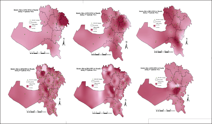 AbstractBackground: Highly pathogenic avian influenza (HPAI) (H5N1) has been endemic in Egypt for almost two decades, profoundly impacting both the poultry industry and public health. Egypt stands as a prominent epicenter for HPAI H5N1 outbreaks in Africa, marked by the highest number of positive human cases. Despite continuous governmental efforts, prior research underscored the inadequacy of strategies in controlling the virus spread. Aim: This study identified spatiotemporal patterns and high-risk clusters of HPAI H5N1 outbreaks at the subdistrict level. Methods: This study involved trial tracking of HPAI H5N1 endemicity dynamics, enabling tailored interventions at a regional level based on robust epidemiological investigations to address the persistent challenge of HPAI H5N1 in Egypt. This study illuminated spatiotemporal outbreak dynamics, with specific attention on Menofia governorate. Results: Despite the region’s early poultry impacts, initial outbreaks did not originate from Menofia in studied epidemic waves (EWs). Outbreak risk spatial distribution displayed an escalating pattern at the northern border, followed by risk reduction through the sixth EW. The predominant hot spot region was localized within rural districts, particularly villages, while urbanization coincided with lower outbreak density. Observed smoothed densities revealed epidemic propagation within urban centers, preceding its transition to new areas and establishing direct connections with neighboring cities. Primary cluster prognostication was plausible, occurring in regions previously hosting elevated relative risk clusters during preceding EWs. Identification of enduring pinpoint clusters, persistent for extended durations, indicated close contact dynamics and localized viral circulation within populations. Conclusion: This study highlights the significance of customized regional interventions based on the rigorous epidemiological framework. This approach is pivotal in the profound comprehension of endemicity dynamics, efficiently limits geographical infection spread, and contains outbreaks within delineated areas. Keywords: Endemicity dynamics, Highly pathogenic avian influenza, Risk clusters, Spatiotemporal dynamics, Tailored intervention strategies. IntroductionHighly pathogenic avian influenza (HPAI) subtype H5N1 poses a significant threat to the global poultry industry due to its genetic variability and pandemic potential (Otte et al., 2008). In Egypt, the emergence of HPAI H5N1 in poultry was noted in February, 2006; marking the second African nation to report such an infection (Saad et al., 2007; Aly et al., 2008). Egypt stands out with the highest number of HPAI H5N1 notifications of positive human cases (Harfoot and Webby, 2017; Young et al., 2018) and is considered a significant epicenter for HPAI H5N1 outbreaks in Africa (Ekong et al., 2018). Despite persistent governmental efforts to curtail its dissemination, previous publications have revealed the insufficiency of applied strategies in effectively controlling the HPAI-H5N1 virus (Elsobky et al., 2021). As a result, HPAI H5N1 remains entrenched and exerts severe repercussions on both the poultry sector and public health (Matrosovich et al., 1999; Kalthoff et al., 2010). Egypt’s poultry production predominantly occurs in lower Egypt, with concentrated outbreaks in the Nile Delta region due to dense poultry populations and agricultural activities (Arafa et al., 2012; El-Zoghby et al., 2013; Sheta et al., 2014; Arafa et al., 2016a; Elsobky et al., 2022). The reported outbreak rates, however, may underestimate the virus’s true prevalence and it does not fully reflect the true widespread endemic situation of the virus in the region due to the prevailing policy of under-reporting of the disease in the commercial sector in an attempt to protect their business interests and to prevent the mass culling of poultry stocks (Farnsworth et al., 2010; Kayali et al., 2011). In Egypt, HPAI H5N1Clade 2.2 after its emergence has spread quickly across both backyard and commercial flocks (Saad et al., 2007; Aly et al., 2008). Subsequent epidemic waves (EWs) have been documented since 2006, with Clade 2.2.1 observed during the first wave (Balish et al., 2010; Arafa et al., 2016a). A novel variant, Clade 2.2.1.1, emerged during this time, possibly due to vaccination efforts (Arafa et al., 2016a). Despite interventions, the virus continued to spread among vaccinated backyard and commercial poultry, causing significant social and economic losses (Kayali et al., 2016). Egypt was officially designated as an Avian Influenza endemic nation in 2008, underscoring the virus’s evolving nature (El-Shesheny et al., 2014). Clade 2.2.1.1 further diversified between 2008 and 2011 into two clusters (Arafa et al., 2016b). Notably, these clusters ceased to emerge thereafter (Arafa et al., 2016b), but a new variant (subclade 2.2.1.2) emerged in early 2014, with no significant alterations were found in the circulating viruses until 2016 (Arafa et al., 2015; Abdelwahab et al., 2016). A critical obstacle hindering the successful implementation of control strategies lies in the absence of detailed and meaningful epidemiological investigations (Farnsworth et al., 2010). Country-level aggregated data, at times, obscure smaller, high-risk clusters (Jones and Kulldorff, 2012; Elsobky et al., 2022). Therefore, the detection of the spatial cluster of the outbreaks could have been made accurately when involving finer detailed data in sub-districts within villages, and more reliable surveillance data in addition to up-to-date reported outbreak data (Dhingra et al., 2014). Our primary objective was to develop an innovative epidemiological approach to enhance control policies against HPAI H5N1 in Egypt. This approach centers on identifying spatiotemporal patterns and high-risk clusters at the subdistrict level, with tracking of HPAI H5N1 endemicity dynamics enabling tailored interventions guid