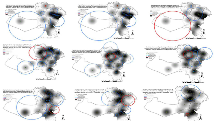 Fig. 5. Spatial patterns and spatio-temporal clusters of daily, weekly, and monthly based outbreaks of highly pathogenic avian influenza subtype H5N1 over six EW in Menofia governorate. Outbreaks represented by light green dots and outbreak density from adaptive kernel density estimation highlighted in monochromatic grey (the higher the density, the darker the color). Significant spatio-temporal clusters detected from the space–time permutation scan statistics are illustrated by the most likely cluster (red circle) and by a secondary cluster (blue-dashed circles). DiscussionOur study aimed to investigate the spatiotemporal pattern, identify, and trace the highest risk clusters of HPAI H5N1 outbreaks at the subdistrict/village level within Menofia governorate, from 2006 to 2017 as a trial for tracking the HPAI H5N1 endemicity dynamics for better establishment of effective disease control strategies at that level. Epidemic waves of HPAI H5N1 outbreaks in Menofia governorateThe analysis of HPAI subtype H5N1 outbreaks in Menofia governorate revealed a notable pattern across six distinct EWs, characterized by varying time scales of day, week, and month. These EWs exhibited consistent patterns, underscoring the robust epidemic nature of the disease. The duration of each EW ranged from 3, 5, 3, 38, 7, and 39 months, as depicted in Figure 1. Notably, the epidemic curve within Menofia governorate closely mirrored the temporal patterns observed in Egypt’s broader epidemiological landscape, as elucidated by previous research conducted by (Elsobky et al., 2021; Elsobky et al., 2022), and a global study by (Zhang et al., 2012). A recurring feature of the epidemic curve is the occurrence of disease peaks in December and January, indicative of an apparent non interpreted epidemic cycle. This pattern aligns with the cyclic nature of the disease, highlighting its endemic status. The configuration of the epidemic curve, characterized by a brief vertical span and an extensive horizontal span, underscores the endemicity and suggests an expanding spatial distribution of outbreaks over time within the governorate. Menofia governorate played a pivotal role in the broader Egyptian EW. For instance, the first EW in Menofia governorate commenced merely 1 week following the disease’s initial introduction in Egypt and concluded 2 months prior to the termination of the country’s inaugural EW, according to the EW of HPAI H5N1 outbreaks in Egypt described by Elsobky et al. (2022). Notably, the 2.2.1 Clade emerged during the first EW and persisted throughout the subsequent second and third EWs. Additionally, the 2.2.1.1 Clade, introduced in the second EW, continued to be prevalent during the third EW, ultimately culminating in endemicity by El-Shesheny et al. (2020). Remarkably, Menofia governorate consistently reported higher outbreak numbers during distinct EWs, although it was not the origin of outbreaks. This phenomenon can be attributed to the high density of the poultry population in the governorate, thereby contributing to its prominence in outbreak notifications. Further exploration of the fourth EW in Menofia reveals a distinct epidemiological landscape. This wave was notable for being associated with the coexistence of two clades, namely 2.2.1.1a and 2.2.1.2, coinciding with the emergence of H9N2 (El-Shesheny et al., 2020; Elsobky et al., 2022). It is noteworthy that the fourth EW exhibited a peculiar pattern wherein outbreaks initially occurred during warmer months, suggesting a possible link between clade stability and thermostability (El-Shesheny et al., 2020). This underscores the virus’s capacity for sustained endemicity through adaptive processes (Arafa et al., 2016a; Salaheldin et al., 2018). During the fifth EW, a protracted duration of continuous outbreak notifications was observed, characterized by irregular peaks and altered epidemic cycles. This phenomenon, corroborated by the presence of clades 2.2.1, 2.2.1.1a, and 2.2.1.2, aligns with the concept of viral adaptation and endemicity, a notion that concurs with findings by El-Shesheny et al. (2020). Conversely, the sixth EW culminated without distinct peaks or discernible patterns, potentially attributed to under-reporting and limitations within the surveillance system. This observation resonates with the findings of Elsobky et al. (2022) regarding EWs in Egypt. In essence, the analysis of HPAI H5N1 outbreaks in the Menofia governorate underscores the dynamic interplay between viral evolution, adaptation, and endemicity across distinct EWs. The governorate’s role in shaping the broader epidemiological landscape is pivotal, and the implications of these findings emphasize the importance of vigilance and refined surveillance strategies to address and manage the evolving dynamics of HPAI H5N1 outbreaks to contain outbreaks within delineated areas where the initiation phase starts before the outbreak acceleration phase. The spatial pattern of outbreak density in Menofia governorateThe geographic distribution of HPAI H5N1 outbreaks in Egypt has been extensively studied, consistently revealing a concentration of poultry outbreaks within the densely populated Nile Delta region, while demonstrating comparatively lower densities in upper Egypt (Albayoumi et al., 2013; Kayali et al., 2016; Young et al., 2018; Elsobky et al., 2022). This pattern is attributed to the significant poultry stocks and human population present in the Nile Delta region (Arafa et al., 2012). Notably, more than half of Egypt’s population is in direct proximity to poultry in the Nile Delta region, as reported by Abdelwahab and Hafez (2011). Consequently, the Menofia governorate, situated within lower Egypt, assumes a notable role in the potential zoonotic transmission of H5N1, as outlined in a previous study (Young et al., 2018). As evident from Figure 4, the spatial risk of HPAI H5N1 outbreaks escalates along the governorate’s borders with neighboring provinces, partic