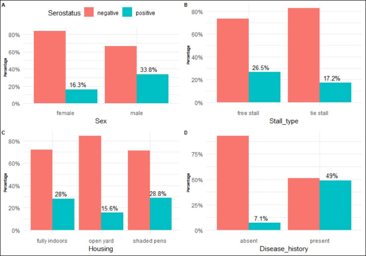 Fig. 3. Seroprevalence of BoHV-1 in the studied herds. A: Seroprevalence according to sex, B: Seroprevalence according to stall type, C: Seroprevalence according to housing, D: seroprevalence according to history of respiratory illness. The Italian buffaloes besides the native and cross-breed cattle were more vulnerable to infection with IBR than Holstein breed (p-value 0.07). Females had a lower risk of infection relative to males [OR=2.51, CI 95%: 1.55–4.05]. The animals reared in free stalls and closed houses had a higher risk for infection than those reared in tie stall and open yards (p-value 0.01). The odds of infection in animals reared in closed houses or shaded pens were twofold as the infection in animals reared in open yards. The animals with a history of recent respiratory tract infection were 11 times higher for being seropositive for IBR infection compared with their counterparts [OR=0.09, CI 95%: 0.05–0.16], (Table 2). Multivariate regression analysisThe final model (Table 3) revealed that the animal’s breed and age besides season, type of stall, and history of respiratory signs were significantly associated with the seroprevalence of IBR (p-value < 0.05). The probability of infection increased by decreasing the ambient temperature. The risk of infection with IBR in the winter and spring months was 5.9 and 2.5 times higher than in autumn. On the other hand, the odds of infection in summer were lower than in autumn by 1.6 times. The weaned and yearling cattle were more exposed to the IBR infection than adult cattle. The risk of exposure to IBR infection was lower in tie stall houses than in free stall houses (p-value 0.03). The odds of exposure to the infection in buffaloes were 7.2 times higher than in the Holstein breed. However, the Holstein breed was more exposed to infection than native and cross-breed cattle by 3.5 and 1.4 times (p-value 0.02). The risk of seropositivity to IBR was higher in animals with a history of recent respiratory manifestation than those without a history of recent respiratory problems. DiscussionThe objective of this study was to evaluate the prevalence and potential causes of IBR in Qutur district within Gharbia governorate, Egypt, using indirect ELISA. Qutur is one of the largest districts with the largest number of livestock in Gharbia governorate and one of the largest dairy-producing districts in the Republic. Table 2. The univariate logistic regression model for risk factors associated with BoHV-1 infection.