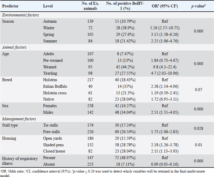 where n=Sample size, P exp=Expected true population, and d=Desired margin of error. Samples and data collectionSix commercial dairy farms and 12 smallholder farms were selected randomly for this survey. All investigated farms did not use vaccination protocol against BoHV-1. A total of 400 blood samples were collected from 360 cattle of different breeds and 40 Italian buffaloes for diagnosis of IBR infection. Out of them, 318 animals were reared in the commercial farm system, and 82 animals were reared in the traditional farm system (Table 1). The blood samples were collected aseptically from the jugular vein in sterile vacutainer tubes without anticoagulant for serum separation. All samples were transported in an ice box to the laboratory of the Virology Department, Animal Health Research Institute, Giza, Egypt. The serum samples were separated and frozen at −20°C until further examination. The data regarding the date of the visit and animals’ breed, age, sex, housing condition, and history of recent respiratory illness were recorded during sample collection. Indirect ELISABoHV-1 antibody test kits were obtained from ID vet (Innovative Diagnostics, France, Reference code: IBRS-5P, Lot No: G64). The tests were performed according to manufacturer instructions. Briefly, the antigen-coated microtiter plates were incubated with 10 µl of diluted serum samples (1:10) for 45 minutes at 37°C. The plates were washed three times with at least 300 µl of diluted washing solution (1/20 in distilled water) and incubated with 100 µl of anti-ruminant peroxidase conjugate for 30 minutes at 37°C. The plates were rewashed three times, and 100 µl of substrate solution (TMB) was added to each well for 15 minutes at 21°C. Finally, 100 µl of stop solution was added to stop the reaction. The optical density was measured by a Microtiter plate reader (Biotech 808) at a wavelength of 450 nm. The S/P percentage ≥ 60% is considered positive. Statistical analysisThe statistical analysis was performed with the SPSS program (SPSS 20 for Windows, SPSS Inc., Chicago, IL, USA). The objected explanatory variables were age, sex, d breeds of the animals, season, housing, type of stall, and history of recent respiratory manifestation. The response variable was the serological status of the examined animals (either seronegative or seropositive) for BoHV-1. The Univariate logistic regression model was used firstly to evaluate the association between each independent variable and the serological status of IBR. The predictors with p values ≤ 0.20 were retained in the final multivariate logistic regression model. The predictors with a p value < 0.05 were considered significant.