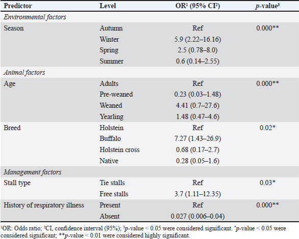 The probability of infection increased by decreasing the ambient temperature. The risk of infection with IBR in winter and spring was 5.9 and 2.5 times higher than in autumn. This result was consistent with Hashemi et al. (2022) in South Iran who found that the percentage of seropositivity of BoHV-1 was higher in the cold season than warm season. On the contrary, Hekal et al. (2019) did not find any significant difference in the seroprevalence of IBR between summer and winter seasons in imported cattle from Sudan to Egypt. On the other hand, a Sudanese study reported that the seroprevalence of BoHV-1 was significantly higher in the rainy season than winter season (Elhassan et al., 2011). The obtained result may be explained by the fact that the opportunity for survival of BoHV-1 increases when the ambient temperature is lower (Engdawork and Akilu, 2024). In a comprehensive review of the impact of environmental factors on the infection with BRD, Sáfár et al. (2023) concluded that low temperature combined with high relative humidity led to increase the BRD problems within dairy herds. In our country, the nature of fluctuant weather in the spring may be considered as a predisposing factor for infection with IBR which explains the higher odds of infection in spring. This result was boosted by Callan and Gary (2002) who reported that sudden environmental changes increase the probability of infection with respiratory viral diseases. The age of the animal was considered a potential risk factor for infection with BoHV-1. Most previous studies conveyed that; older animals had higher odds of being positive reactors of BoHV-1 than young animals (Ortiz-González et al., 2022; Barrett et al., 2024). This may be due to the nature of latency of this disease as most of adult animals become seropositive after initial infection (Kalavathi et al., 2024). In contrast, this study revealed that weaned and yearling calves were more exposed to the IBR infection than adult cattle. This result may be imputed to that most of the positive reactors had a near history of BRD infection that was predominantly confined to either pre-weaned, weaned or even fattening calves (Bernal et al., 2023). Also, the age-dependent housing system in dairy herds impedes the spread of the virus between different cattle groups and affects the epidemiologic pattern of BoHV-1 infection within the herds (Waldeck et al., 2021). In the studied commercial herds, calves were classified according to their weaning status and reared in shaded pens while, adult cattle were reared in separated open yards. Another possible explanation was arisen by Woodbine et al. (2009) in West England who conducted a longitudinal sero-epidemiological study of IBR and concluded that the average of seropositivity of adult cattle in unvaccinated herds was less than 50% which may be due to the waning of antibody titer after natural infection over the time. The risk of exposure to the infection was lower in tie stall houses than in free-stall houses. This result was parallel to what was mentioned by Raaperi et al. (2012) who concluded that loose housing exacerbates the problem of BRD because it permits direct contact between animals and enhances the direct transmission of infectious agents accordingly. Similarly, Maier et al. (2019) reported that calf-to-calf contact in free stall houses was significantly associated with a higher occurrence of BRD in dairy herds. The animals with a history of recent respiratory manifestation had higher odds for being seropositive for IBR infection compared with their counterparts. Many authors demonstrated the alignment between the seropositivity to BoHV-1 and a history of recent respiratory illness. Mahmoud et al. (2009) found a higher seroprevalence of IBR among the clinically diseased cattle compared with the apparently healthy ones. On the same approach, Dima et al. (2024) found that the probability of IBR infection in cattle with respiratory problems was 18 times higher than that in cattle without respiratory problems. This refers to the recrudescence of BoHV-1 as a main cause of BRD infection in cattle. Although this study focused on the association between respiratory illness and BoHV-1 infection, it neglected other forms of the disease, like reproductive disorders, which may have a great economic impact on the studied herds. Also, Additional studies are required for the molecular diagnosis of BoHV-1. However, the serum dilution of 1:10 may have caused false results due to the probable high concentration of antibodies. Nevertheless, a short incubation period of 45 minutes, as stated in the manufacturer’s protocol, could help mitigate this issue. Buffaloes are a different animal species, so their immune response to IBR can differ slightly from that of cattle. However, the manufacturer protocol does not specialize in certain reassessments for cut-off values for buffaloes. Further investigation using different ELISA kits is recommended to confirm our results and achieve more specificity. ConclusionThis research study revealed that IBR is prevalent among dairy cattle reared under both production systems in Gharbia governorate. Statistical modeling showed that type of housing, history of recent respiratory illness, age of animals and environmental stressors are the strongest predictors of IBR occurrence. The estimated seroprevalence provides the basis for future surveillance of the disease with recommendations for further comprehensive planned longitudinal researches on BoHV-1 to obtain a complete picture regarding the other forms of the disease and introduce the appropriate vaccination protocol to conserve our dairy industries from potential economic losses due to this disease. AcknowledgmentsThe authors are grateful to the animal owners of the private dairy farms and smallholders in Gharbia Governorate, Egypt, for subjecting their animals to the study. Conflict of interestNo authors declare a conflict of interest. FundingThis r
