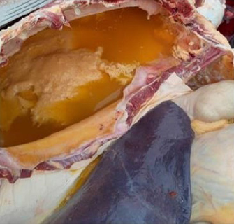 Fig. 1. CBPP infected animal at slaughter showing collection of pleural fluid.