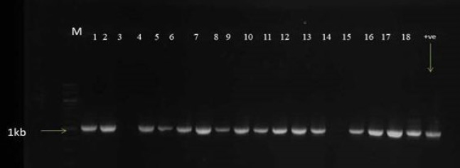 Fig. 5. Mmm specific PCR showing 1.1kb amplicon size. Lane M: 100 base pair ladder. Line 1-18: positive isolates. Lane +ve: for positive control.