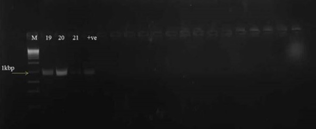 Fig. 6. Mmm specific PCR showing 1.1kb amplicon size. Lane M: 100 base pair ladder. Lane 19-21: positive isolates. Lane +ve: for positive control. Confirmation of Mmm by conventional PCRTwenty one out of the 25 Mycoplasma isolates cultured on PPLO agar were confirmed as M. mycoides subsp. mycoides using conventional PCR as described by Miles et al. (2006). Production of a band equivalent to 1.1 kbp and at the same distance with T1/44 positive control confirms the presence of Mmm (Figs. 5 and 6). DiscussionThe South east region of Nigeria is estimated to have a cattle population of 4.5 million (Ikhatua, 2011). There is an apparent successful settlement of pastoralist within the Southern region of Nigeria in the past four decades with thousands of zebu cattle (Blench, 1994). However, most of the studies on CBPP are centered within the Northern region, where most of the cattle population is located. In this study, the overall Mmm isolation rate was 27.75%. Twenty five of the isolates were positive on PPLO agar. This high isolation rate could be attributed to the fact that purposive sampling method was used for this study. Only apparently sick animals showing classical clinical signs and gross lesions suggestive of CBPP at the abattoirs were sampled. Samples such as pleural fluid and pneumonic lungs were collected from the abattoirs. Pleural fluid accumulation is one of the characteristic of CBPP and is considered as one of the best medium for the isolation of M. mycoides subsp. mycoides (Thiaucourt et al., 2006). Anambra state recorded the highest isolation rate of Mmm. Perhaps, more animals showing classical gross lesions of CBPP at the slaughter house were sampled in Anambra state followed by Enugu State. However, there was no isolate from Imo state. The failure to isolate Mmm in Imo state could be because most of the cattle sampled were apparently healthy, showing no classical gross lesions of CBPP at the abattoir. Similarly, the presence of antibiotics contamination in the collected samples may have also accounted for the inability to recover mycoplasma from the samples. The isolation rate in this study is in contrast to studies by Jasini et al. (2016), who recorded an overall isolation rate of 3.33% in the North eastern region of Nigeria. Similarly, Nwankpa (2008), recorded 6.27% from cattle within Northern Nigeria. Ikpa et al. (2020) also recorded a lower isolation rate of 4% in Nasarawa State, Nigeria. Several genomic and molecular tools have been developed for the identification and confirmation of M. mycoides subsp. mycoides (Bashiruddin et al., 1994: Miles et al., 2006). PCR is a robust technique for the detection, identification, and differentiation of members of the M. mycoides cluster (Miles et al., 2006). In this research, out of the total of 25 Mmm isolates positive on PPLO culture medium, 21 isolates were confirmed to be M. mycoides subsp. mycoides by PCR. The isolates yielded molecular size of 1.1 kbp specific for Mmm. This is in agreement with the findings by Miles et al. (2006). Generally, species within the M. mycoides cluster share many immunological, biochemical and genetic properties; which can result in major problems for diagnostic laboratories in the identification process of field strains (Cottew et al., 1987; Persson et al., 2002). Perhaps, some of the positive isolates on PPLO agar in this study were Mycoplasma species within the Mycoplasma cluster as the isolates were not subjected to biochemical tests. The use of PCR for the confirmation of Mycoplasma species from several clinical samples has shown a higher efficiency, specificity, and sensitivity for laboratory diagnosis when compared with conventional culture-based diagnostic procedures (Bashiruddin et al., 1994). ConclusionThis study confirms the presence of M. mycoides subsp. mycoides in South eastern Nigeria. This is the first report on the isolation and confirmation of Mmm in South-eastern region of Nigeria. We, therefore, recommend active surveillance and vaccination programs within the region for the control and prevention of Contagious Bovine Pleuropneumonia. AcknowledgementsWe sincerely thank the Executive Director of NVRI, Dr David Shamaki, for the kind approval of some of the CBPP vaccines used for this research. Conflict of interestThe authors declare no conflict of interest. Authors contributionSOO, CNK, and AKBS supervised the study. KCA, PDL, and PIA collected and analyzed the samples. KCA wrote the manuscript. All authors read and approved the manuscript for submission. ReferencesAnkeli, P.I, Raji, M.A., Kazeem, H.M., Tambuwal, F.M., Francis, M.I., Ikpa, L.T., Fagbamila, I.O., Luka, P.D. and Nwakpa, N.D 2017. Seroprevalence of Contagious Bovine pleuropneumonia in plateau state, North-Central Nigeria. Bull. Anim. Hlth. Prod. 65, 357–366. Bashiruddin, J.B., Taylor, T.K. and Gould, A.R. 1994. A PCR-based test for the specific identification of Mycoplasma mycoides subspecies mycoides. J. Vet. Diagn. Invest. 6(4), 428–434. Blench, R. 1994. The expansion and adaptation of Fulbe Pastoralism to sub-humid and humid conditions in Nigeria. Afican studies Centre Leiden. Cahier d’ Etudes Africaines, pp: 197–212. Campbell, J. 2015. Contagious Bovine pleuropneumonia. In The Merck’s veterinary manual. Eds., Kahn, C.M., Line, S., Aiello, S.E. Whitehouse Station, NJ: Merck and Co. Available via www.merckvetmanual.com (Accessed 04 November 2020). Chima, J.C., Lombin, L.H., Molokwu, J.H., Abiaye, E.A. and Majiyagbe, K.A. 2001. Current situation of contagious bovine pleuropneumonia in Nigeria and the relevance of c-ELISA in the control of the disease. Proceedings of the Research coordination meeting of the FAO/IAEA coordinated research programmeheld in Nairobi, Kenya. Cottew, G.S., Breard, A., Damassa, A.J., Erne, H., Leach, R.H., Lefevre, P.C., Rodwell, A.W. and Smith, G.R. 1987. Taxonomy of the Mycoplasma mycoides cluster. Isr. J. Med. Sci. 23, 632–635. Danbirni, S., Okaiyeto, S.O., Pewan, S.B. and K
