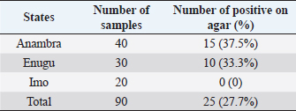 AbstractBackground: Mycoplasma mycoides subsp. mycoides is the causative organism of Contagious Bovine Pleuropneumonia (CBPP). It is a trans-boundary disease and an endemic in Nigeria having caused serious financial loss for the country’s economy. Aim: This study was undertaken to isolate and confirm the presence of M. mycoides subsp. mycoides (Mmm) in cattle, from three selected South-Eastern states of Nigeria. Method: A total of 90 bovine samples (25 pleural fluids and 65 lung tissues) suggestive of CBPP were collected from different abattoirs in the three selected South-eastern states of Nigeria (Anambra, Enugu, and Imo), for the isolation of Mmm by employing cultural method, whereas for confirmation polymerase chain reaction (PCR) approach was used. The collected samples were cultured on Pleuropneumonia like organism (PPLO) agar according to specific protocols. Results: Twenty five of the samples (lungs and pleural fluid) were positive for Mmm on PPLO agar giving an isolation rate of 27.7%. Only 21 of the isolates were further confirmed using PCR. The PCR amplification of the isolates produced a product of 1.1 kbp which is specific for Mmm. No positive isolates were recovered from Imo state. Conclusion: This study confirms the presence of Mmm as the causative organism of CBPP in Southeast Nigeria. It is recommended that active surveillance and vaccination protocol should be undertaken in the region for the control and prevention of this disease. Keywords: Cattle; CBPP; Mycoplasma mycoides subsp. mycoides; Polymerase chain reaction. IntroductionMycoplasma mycoides subsp. mycoides (Mmm) is the etiological agent of Contagious Bovine Pleuropneumonia (CBPP) (Thiaucourt et al., 2006; Campbell, 2015). It is a highly contagious and fatal disease of cattle, with serious financial implication in Nigeria (Fadiga et al., 2013). CBPP is a trans-boundary disease and has been classified as one of the bacterial diseases in OIE’s list A diseases (OIE, 1997; Litamoi et al., 2004). CBPP can manifest in hyper-acute form, where it is usually fatal and most times no clinical signs are observed (Thiaucourt et al., 2006). The incubatory period of this disease is relatively long with an inconsistent clinical course (Litamoi et al., 2004). Clinical signs of the disease include anorexia, fever, dyspnea, cough, and nasal discharges (Provost et al., 1987). Infections in adult cattle are most of the time restricted to the respiratory tract, while in calves, the disease usually manifests as arthritis (Litamoi et al., 2004; Campbell, 2015). Several molecular tools and technologies have been developed for the identification and confirmation of the causative organism (Dedieu et al., 1994; Lorenzon et al., 2002; Miles et al., 2006). Miles et al. (2006) developed a polymerase chain reaction (PCR) technique that could differentiate Mycoplasma species based on their origin. The PCR method is quite efficient and specific. The United States of America and Australia have eradicated CBPP through strict control of cattle movement, prohibiting large scale slaughter, and financial compensation to owners. This has, however, become difficult in Nigeria due to several factors, such as poor implementation of the test and slaughter policy, unrestricted movement of nomads across state boundaries which has made accurate monitoring of CBPP difficult (Egwu et al., 1996; Chima et al., 2001). Several authors have documented the outbreaks, prevalence, and economic importance of the disease in Nigeria (Fadiga et al., 2013; Ankeli et al., 2017; Jasini et al., 2016). In Africa, the application of the stamping out policy for the eradication of CBPP has faced so many challenges. Consequently, the control of the disease has depended heavily on the use of the vaccine (T1/44 or T1-SR) (Thiaucourt et al., 2000; Litamoi et al., 2004). National Veterinary Research Institute (NVRI) Vom, produces CBPP vaccine (T1/44) in Nigeria (NVRI, 2007). However, this vaccine has some drawbacks (Egwu et al., 1996; Thiaucourt et al., 2006). Presently, in Nigeria, there is little or no information on the status of this disease in South-East Nigeria as many studies have been centered within Northern Nigeria (Nwankpa, 2008; Danbirni et al., 2010; Okaiyeto et al., 2011; Jasini et al., 2016). Therefore, data generated from this research can serve as the baseline data for future studies in the region. Material and MethodsStudy areaThis study was undertaken in three selected South Eastern states of Nigeria (Anambra, Enugu and Imo states). The South-Eastern region is one of the geopolitical zones in the country. It consists of Anambra, Enugu, Imo, Ebonyi, and Abia states. Anambra state lies between latitude 5° 32′ and 6° 45′ N and longitude 6° 43′ and 7° 22′ E; Enugu state lies between latitude 5° 27′and 6° 33′ N and longitude 6° 28′ and 7° 32′ E, and Imo state is located between latitude 4° 45′ and 7° and 15′ N and longitude 6° 50′ and 7°25′ E. The region has an estimated cattle population of 4.5 million from a total of 16.3 million estimated cattle population in Nigeria (Ikhatua, 2011). Sample collection and processingA total of 90 bovine samples (65 lungs tissues and 25 pleural fluids) were collected from slaughtered animals showing classical signs of CBPP at the abattoir (Figs. 1 and 2). Samples were collected for 4 months between December 2019 and March 2020. The lung tissue samples were collected using sterile blades. Pleural fluids were collected using sterile 18G syringes (Fig. 1). Subsequently, all the collected samples were put in sterile sample bottles and transported in CBPP transport medium pleuropneumonia like organism (PPLO broth). They were properly labeled and conveyed to the Mycoplasma laboratory of NVRI, Vom for further processing. Culture and isolation of Mycoplasma specieThe lung tissues and pleural fluids collected from the suspected cattle at the abattoir were cultured in PPLO growth medium adhering to specific 