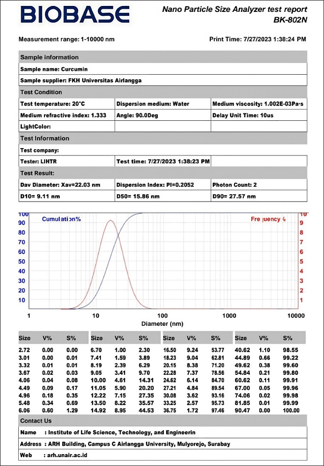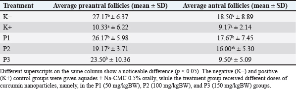 Fig. 1. Nanoparticle size analyzer test. MethodsTreatment on 30 female white rats was randomly divided into five groups, namely, K(–), K(+), P(1), P(2), and P(3) groups. The negative control group (K–) was given aquadest peroral aquadest + Na-CMC 0.5% for 30 days without exposure to carbon black. The positive control group (K+) was given aquades + Na-CMC 0.5% peroral and then given perinhalation carbon black exposure at a dose of 1064 mg/m3 for 6 hours/day for 30 days. Treatment group 1 (P1) was given 50 mg/kgBB of peroral curcumin nanoparticles and then given exposure to perinhaled carbon black at a dose of 1064 mg/m3 for 6 hours/day for 30 days. Treatment group 2 (P2) was given curcumin nanoparticles of 100 mg/kgBB perorally and then given exposure to perinhaled carbon black at a dose of 1064 mg/m3 for 6 hours/day for 30 days. Treatment group 3 (P3) was given curcumin nanoparticles of 150 mg/kgBB orally and then given perinhalation exposed to carbon black at a concentration of 1064 mg/m3 for 6 hours/day over 30 days. The determination of the dose for the administration of curcumin nanoparticles to white rats refers to a study conducted by Konatham (2020), namely, curcumin nanoparticles with doses of 50 mg/kgBW, 100 mg/kgBW, and 150 mg/kgBW. The implementation of the research began with the adaptation of female rats for 7 days and grouping. On the eighth day, carbon black exposure treatment began to be given to K(+), P1, P2, and P3. The treatment of experimental animals was carried out for 30 days, and on the 31st day, the rats were weighed and euthanized using ketamine at a dose of 0.1 ml/kgBB intraperitoneally. After the anesthesia of white rats is operated on by making an incision in the abdominal area, then the ovarian organs are removed and inserted into an organ pot in which there is 10% formalin. The ovarian organ will then be made histopathological preparations to examine the number of preantral and antral follicles with HE staining. The calculation of the number of preantral and antral follicles was carried out using a light microscope with 40× magnification and optilab. Observations were carried out by combining the histological preparation starting from the top-left corner of the preparation and then moving spirally to the lower right to get the five best fields of view. Data analysisData analysis in this study was carried out using the ANOVA test with statistical product and service solution computer software. If there is a real difference between the treatments (p < 0.05), it is followed by the Duncan test to find out the differences in each treatment group. Ethical approvalThis research has received an ethics certificate from the Ethics Commission of the Faculty of Veterinary Medicine, Universitas Airlangga (No.2. KEH.171.11.2024). The research conducted is experimental research. This study uses a post-test-only control group design with a simple random design treatment. This research was carried out using 30 female rats at the age of 2 months. ResultsBased on the research that has been carried out, the average number of preantral and antral follicles is obtained. Examination of ovarian histopathology preparation data was carried out to calculate the number of preantral follicles and antral follicles from each group by looking at each tail from five fields of view using a microscope and raster image application. Average preantral folliclesIn Table 1, it can be seen that the average number of preantral follicles in the K(−) group that was only given aquadest + Na-CMC 0.5%, which was 27.17 showed a significantly different result (p < 0.05) compared to the K(+) group who was given exposure to carbon black of 1064 mg/m3, which showed an average of 10.33. On average, each treatment group was given curcumin nanoparticles with a certain dose before exposure to carbon black 1064 mg/m3, and it was obtained that the P1 group had the highest average number of preantral follicles, which was 26.17, while the P2 group had the lowest average number of preantral follicles, which was 19.17 and P3 23.50. The average histopathological features of the preantral follicles can be seen in Figure 2. Average antral folliclesBased on Table 1, the average number of antral follicles in the K(−) group that was only given aquadest + Na-CMC 0.5%, which was 18.50 ± 8.89, showed a significantly different result (p < 0.05) compared to the K(+) group exposed to carbon black of 1064 mg/m3, which was 9.17 ± 2.14. On average, each treatment group was given curcumin nanoparticles with a certain dose before exposure to carbon black 1064 mg/m3, and it was seen that the P1 group had the highest average number of antral follicles, which was 17.67 ± 7.45, while the P3 group had the lowest average number of antral follicles, which was 9.50 ± 5.09, and the P2 group was 16.00. K(+) was not significantly different (p > 0.05) from the P3 group. This shows that the administration of carbon black in the K(+) group has a real effect on the number of antral follicles and in the P3 group that is exposed to carbon black and the dose of curcumin nanoparticles of 150 mg/kgBB gives similar results to the K(+) group. The P2 group did not differ significantly (p > 0.05) from the K(+) and P3 groups. In addition, P2 is not significantly different from the (K−) and P1 groups. In the data obtained, it can be seen that P1 does not differ significantly (p > 0.05) from K(−), showing that the dose used in P1 can give an average value that is close to the K(−) value. The mean histopathology of antral follicles can be seen in Figure 3. Table 1. Average and standard deviation of preantral and antral follicles exposed to carbon black and given curcumin nanoparticles.