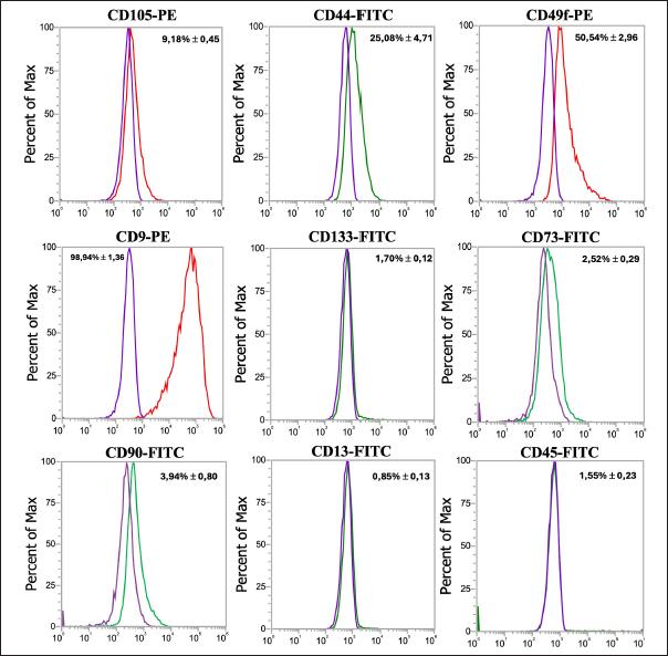 Fig. 2. Representative histograms showing the expression of CD45 as a hematopoietic surface marker and CD9, CD44, CD49f, CD13, CD45, CD73, CD90, CD105, and CD133 MSC surface markers. The purple histogram represents isotype control, the green histogram represents FITC-conjugated antibodies, and the red histogram represents PE-conjugated antibodies.