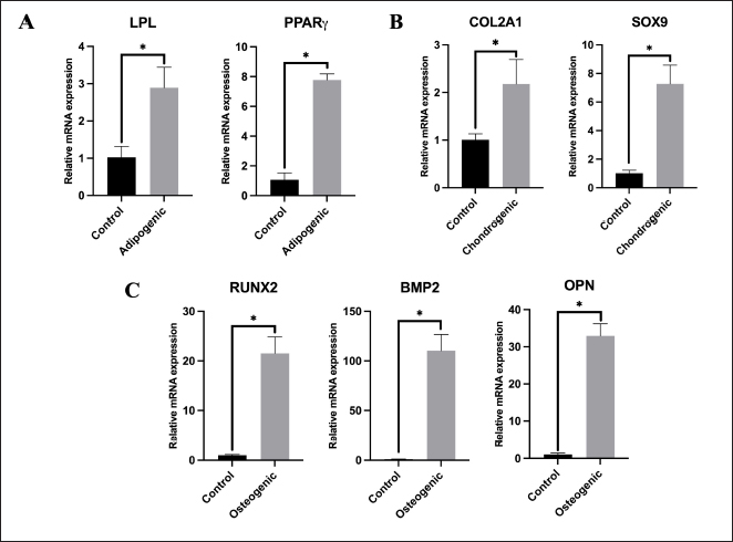 Fig. 4. Gene expression of multilineage differentiation. (A) Adipogenic-related genes (LPL and PPARγ). (B) Chondrogenic-related genes (COL2A1 and SOX9). (C) Osteogenic-related genes (RUNX2, BMP2, and OPN). The differentiation capability into osteocytes, adipocytes, and chondrocytes is an important requirement for the characteristics of MSCs. According to the prior study, visceral Rab-ADMSCs have tri-lineage differentiation properties, shown by the phenotypic characteristic of the positive histo-chemical specific staining and the elevation of expression-associated genes (Zomer et al., 2018; Tirpakova et al., 2021; Koung Ngeun et al., 2023). Visceral Rab-ADMSC exhibited the upregulation of LPL and PPAR expression as well as red-stained lipid droplets inside the cells after 14-day adipogenic induction. PPARγ plays a crucial role in the development of lipid droplets into adipocytes by downregulating Perilipin and CIDEA. These two factors modulate the activity of lipolytic enzymes and remove triacylglycerol from cells also tuning the size of lipid droplet (Vachkova et al., 2016). The upregulation expression of PPARγ and C/EBPα led to the upregulation expression of adipogenesis-regulated factors such as LPL (Kim et al., 2021). The expression of LPL mRNA as an essential factor of adipogenic differentiation was detected at the initial stage of induction and will be stable in the late induction, resulting in mature adipocytes (Hu et al., 2018). Chondrogenic gene-related marker expressions COL2A1 and SOX9 are upregulated and stained positively with Alcian Blue, which was performed in this study. During chondrogenic induction, at the early stage of the induction, the expression of CoL1 and Fibronectin was upregulated and reached the highest level during the chondrogenic differentiation (middle stage). The expression of CoL1 and Fibronectin was subsequently decreased and replaced by higher COL2A1 expression at the late stage (ECM-related genes) (Tang et al., 2015; Robert et al., 2020). SOX9 is essential for the chondrogenic lineage development of MSCs. This activity is triggered when phosphorylated SOX9 directly binds to gene targets, including Collagen type II, IX, and XI, Aggrecan, and Link Protein, thereby causing their transcriptional activity. SOX9 can be found in both chondroprogenitors and mature chondrocytes, and it will directly upregulate the gene expression, specifically in cartilaginous matrix deposition (Sahu et al., 2020; Yang et al., 2022). Osteogenic differentiation potency was assessed by the upregulation of RUNX2, BMP2, and OPN, as well as calcium deposition was stained after 21-day induction. Hedgehog, Wnt/β-catenin, BMP signaling, hormones, growth factors, and epigenetic regulators were all elevated during the early stages of osteogenesis. The osteogenic key factor of RUNX2 was upregulated during the induction. RUNX2 is a precursor of osteogenic-related marker, essential for the differentiation of osteoblasts and for controlling the expression of other osteogenic genes, such as Col1, OPN, and ALP (Mohamed-Ahmed et al., 2018; Robert et al., 2020). Furthermore, BMP2 promotes the osteogenic development of MSCs by upregulating mitochondrial activity and PGC-1α levels (Li et al., 2022; Koung Ngeun et al., 2023). Table 3. Specific MSC surface marker expression.