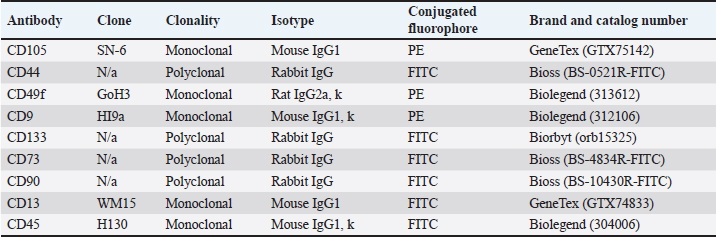 AbstractBackground: As an excellent model for many animal and human diseases, rabbits are the third-most used mammal model after mice and rats. A plethora of studies on the exploration of rabbit mesenchymal stem cells still face discrepancies, especially in the standardization of phenotype and genotype characteristics to support reproducibility in both biomedical and translational research. Aim: This study is aimed to evaluate the characterization and differentiation potential of visceral rabbit adipose-derived mesenchymal stem cells (Rab-ADMSC). Methods: Visceral adipose tissue was obtained from three healthy male White New Zealand rabbits. Cells were further processed and cultivated aseptically. Phenotype and genotype assessments, including morphological observation, proliferation capacity, population doubling time, stemness- and senescence-related genes determination, a set panel of mesenchymal stem/stromal cell (MSC) surface markers evaluation, and multilineage differentiation, were performed in this study. Results: Visceral Rab-ADMSC exhibited fibroblast-like shape morphology and had a plastic adherent ability, expressed stemness- (NANOG, SOX2) and senescence-related (TP53, CDKN1A) markers. Visceral Rab-ADMSC performs high expression of CD9, moderate expression of CD44 and CD49f, dimly expression of CD105, CD90, and CD73, and negative expression of CD13 and CD133 as well as CD45 as a hematopoietic stem cell marker. Despite these discrepancies, visceral Rab-ADMSC maintained its ability to differentiate into osteocytes, adipocytes, and chondrocytes. Conclusion: To recapitulate, visceral Rab-ADMSC reveals the phenotype and genotype characteristics of adult mesenchymal stem cells. The study emphasizes how variations in tissue sources, culture conditions, and techniques can affect the reproducibility and validity of MSC obtained from different specific anatomical depots and species. Thus, the utilization of rabbit MSC as an animal model in biomedical and translational studies should be done with full caution to avoid data misinterpretation. Keywords: Abdominal adipose tissue, Oryctolagus cuniculus, stem cells, regenerative medicine, process innovation. IntroductionRabbit is widely used as an experimental model for human and veterinary medicine because of their ease of handling and relatively economical for daily care. Their size is ideal for surgical procedures and allows for use in a large number of animals, improving the statistical significance. Rabbit is excellent for many applications in biotechnology and translational research, because of their phenotype and genotype similarities with human (Zomer et al., 2018; Tan et al., 2013; Calle et al., 2022). Rabbit adipose mesenchymal stem cells (Rab-ADMSC) have been reported that it has a resemblance in terms of cellular and tissue physiology to human MSC (Zomer et al., 2018). Rabbit adipose mesenchymal stem cells (Rab-ADMSC) have been extensively used to support translational studies in human medicine, such as atherosclerosis, insulin resistance, osteoarthritis, and regenerative medicine (Vachkova et al., 2016; Riester et al., 2017; Tang et al., 2017; Esteves et al., 2018; Schafrum Macedo et al., 2019). Adipose tissues are an excellent alternative source for mesenchymal stem/stromal cells (MSCs) because of their less invasive procedures, less pain, and high-yield cell numbers (Guneta et al., 2016). Adipose tissue-derived MSC obtained from rabbits has been shown to adhere to plastic surfaces and undergo multilineage differentiation (Martinez-Lorenzo et al., 2009; Zomer et al., 2018; Chen et al., 2020; Almaliotis et al., 2021; Tirpakova et al., 2021; Koung Ngeun et al., 2023). Thus, it serves a high potency for the utilization of Rab-ADMSC as an MSC source in supporting biomedical and translational research (Martinez-Lorenzo et al., 2009; Lee et al., 2014; Riester et al., 2017; Zomer et al., 2018). In addition, MSCs obtained from adipose tissues show higher viability, proliferation rate, and differentiation capability compared to bone marrow-derived MSC (Torres et al., 2007; Via et al., 2012; Frese et al., 2016; Koung Ngeun et al., 2023). Rab-ADMSC can be collected from subcutaneous and visceral depots. Although it is harder to collect, visceral Rab-ADMSC showed higher osteogenic potency and high yield compared to subcutaneous depots (Peptan et al., 2006; Jurgens et al., 2008; Cawthorn et al., 2012). Despite a great deal of research on visceral Rab-ADMSC, an inconsistent result has been found primarily due to the lack of characteristic information in cellular and molecular biology basis (Tan et al., 2013). Plethora study on rabbit MSC isolation and characterization revealed that in all studies, the rabbit MSC showed the three-lineage differentiation capability, but the study on MSC surface markers was inconsistent (Lee et al., 2014; Zomer et al., 2018). The obstacle in developing of the standardization rabbit MSC is the difficulties to obtain rabbit-specific antibody provided by the manufacturer. Thus, another approach to assess rabbit MSC surface marker was used, such as gene expression assessment in mRNA level using the RT-qPCR method (Tan et al., 2013; Lee et al., 2014; Tirpakova et al., 2021; Koung Ngeun et al., 2023). According to the International Society for Cellular Therapy (ISCT), the gold standard to evaluate the MSC surface marker should be performed by flow cytometry (Dominici et al., 2006). In addition, there are no guidelines for characterization, and the most recent guideline ISCT only addresses the human mesenchymal stem cells, which may not be valid for multiple species (Wright et al., 2021). Until now, there has been no comprehensive study evaluating the rabbit MSC on both phenotypic and genotypic bases. This study is aimed to establish and validate the Rab-ADMSC characteristics on genotype and phenotype bases. In addition, a set of antibody panels will be used to validate and evaluate the MSC surface marker by flow cytome