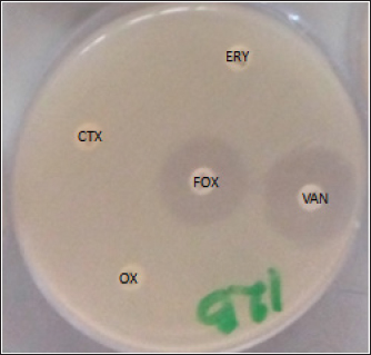 Fig. 1. Multidrug resistance LA-MRSA showing resistant to antibiotics. Oxacillin (OX), cefoxitin (FOX), cefotaxime (CTX), erythromycin (ERY), and vancomycin (VAN). The current observation of this study is also similar to several researchers in different parts of the world who reported different prevalences of S. aureus from poultry meats such as Mamza et al. (2010) who reported 52.5%, Bakheet et al. (2018) who reported 62.8%, and Nworie et al. (2016) who reported 76% prevalence of S. aureus strains. Another study on poultry meat revealed that 42 (72.41%) samples were found positive for S. aureus, which is higher than the report of this research (Sunitha et al., 2017). In the food chain, the contamination of meats, such as chicken by S. aureus, is a serious global issue and the major sources of the contaminants are the food handlers such as the butchers, wholesalers, and retailers of the chicken meat who intend to carry S. aureus in their noses or hands (Tshipamba et al., 2018). The length of time that animals are driven to markets in cages or other vehicles contributes to the spread of S. aureus among the animals, as does the food-producing animals themselves, which can carry the organisms on their skin, nose, and intestine (Ou et al., 2017). Staphylococcus aureus is one of the most significant and widespread foodborne pathogens (Abd El-Ghany, 2021). Staphylococcus aureus produces enterotoxins, which are primarily responsible for food poisoning, and it can cause a wide variety of illnesses, such as septicemia and endocarditis. In 2005, it was determined that animals might also present a health danger to humans due to the discovery of MRSA strains known as LA-MRSA, which have a distinct reservoir in agricultural animals (Thwala et al., 2021). This study identified 7 (11.5%) isolates as LA-MRSA positive out of the 61 (40.7%) samples that were positive for S. aureus. However, 5 (12.8%) and 2 (9.1%) were reported as LA-MRSA positive from broiler and layer chicken meats, respectively. LA-MRSA was found in cattle and poultry at prevalence rates of 6.12% and 6.76%, respectively (Vanderhaeghen et al., 2010). According to another study, there was a 6.76% prevalence of LA-MRSA in chicken flesh from African poultry (Ali et al., 2017). Of the 250 pooled pharyngeal swabs of broiler chickens in The Netherlands, 11 (4.4%) included the LA-MRSA strains (Geenen et al., 2013). LA-MRSA was recovered from nine (7.3%) samples comprising four chicken, three pork, and two turkey products obtained from different butchers and supermarkets (Fox et al., 2016). Friese et al. (2013) revealed the presence of LA-MRSA in broiler samples at a rate of 50%–54% and in turkey samples at 62%–77%. Table 2. Multidrug-resistant pattern of LA-MRSA isolated from chicken meats.