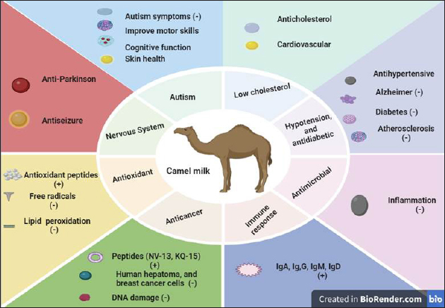 Fig. 2. A schematic that displays the properties of camel milk. Point of freezingCamel milk has a greater freezing point (−0.51°C) compared to cow milk (−0.53°C) because it contains a lower amount of milk solids nonfat content (Konuspayeva et al., 2023). In their study, Desouky (2021) reported that the freezing point of cow milk ranged from −0.57°C to −0.53°C. Conversely, a distinct investigation revealed that the cryoscopic point of camel milk lies within the interval of −0.57°C and −0.61°C, below the cryoscopic point of cow milk. Elevated salt or lactose levels in camel milk could account for its lower freezing point than cow milk (Arain et al., 2023; Konuspayeva et al., 2023). Studies show that camel milk’s freezing point can be higher than cow milk, particularly in soluble components such as lactose and salts (Singh et al., 2017; El-Aziz et al., 2022). Surface tension and specific gravityThe average specific gravity of camel milk is 1.029 and can range from 1.026 to 1.035, with variations observed among different breeds (Abdullahi, 2019; Mohamed-Elhassan and El Zubeir, 2024). The results for cow and human milk, which range from 1.026 to 1.034 (Karmaker et al., 2020), are comparable to these values. There is less information regarding the surface resistance levels of camel milk in contrast with cow milk. However, a study measured the mean surface tension of camel milk to be between 58.39 and 0.421 dynes/cm. Camel milk samples in the United Arab Emirates (UAE) exhibit surface tension ranging from 58.35 to 58.37 dynes/cm (El-Aziz et al., 2022). Furthermore, Wang et al. (2023) demonstrated that the surface tension of camel milk was greater than that of cow milk (42.3–52.1 dynes/cm) and human milk (47.73–1.50 dynes/cm). Lajnaf et al. (2023) attribute the difference in surface tension values in camel milk to the higher level of proteins and substances that are not polar. ViscosityThe viscosity of camel milk falls within the 1.32–1.44-mPa range, which is the greatest compared to cow and human milk (Habtegebriel et al., 2020). Furthermore, Yoganandi et al. (2014) measured the viscosity of Indian camel milk to be 1.77 mPa, whereas they found the viscosity of cow’s milk to be 1.54 mPa. Camel milk in the UAE was shown to have a viscosity ranging from 1.765 to 1.785 mPa at a temperature of 25°C. Tiny floccules, such as fat globules, are responsible for the elevated viscosity of camel milk (Arain et al., 2023). In addition, Seifu (2022) discovered that the viscosity of camel milk is 1.72 mPa, smaller than cow milk in terms of DM and amount under identical conditions (2.04 mPa). The divergent findings can be attributed to variations in husbandry practices, particularly about water provision. The milk from heifers deprived of water for a few days was shown to be watered; this is likely to prevent the calf from experiencing dryness under drought conditions. The concentration of milk’s components, pH level, temperature, and thermal history primarily determine its viscosity. The main factors determining milk’s thickness are proteins and fats, present in smaller quantities in camel milk than in cow’s milk (Habtegebriel et al., 2020). The Therapeutic Effects of Camel MilkEffects that protect the nervous systemCamel milk has therapeutic potential for neurological illnesses. A study using animal (rat) models found that camel milk exhibits anti-Parkinson action. Camel milk significantly reduced Parkinson’s disease in animals compared to control and standard medication groups, causing mild degenerative changes in brain histopathology analysis (Seifu, 2022). Figure 3 shows a diagram explaining the healing advantages of camel milk. In a separate investigation, Khatoon et al. (2015) and Behrouz et al. (2022) found that camel milk has antiseizure and neuroprotective properties, as demonstrated by inducing seizures in animals with strychnine and comparing its effects with diazepam. The administration of camel milk to mice resulted in antiseizure effects, characterized by a delay in the start of seizures, reduced convulsions duration, and a drop-in mortality rate compared to mice treated with distilled water. In mice treated with camel milk, the histological examination of the brain revealed a notable preservation of hippocampal neurons. Unlike animals treated alone with strychnine, these neurons appeared generally normal and healthy, with only minimal damage identified (Khatoon et al., 2015). Therefore, camel milk can serve as an alternate remedy for seizure disorders, effectively preventing the harmful effects of drugs and the development of drug resistance (Seifu, 2022). Table 2 provides a concise overview of camel milk’s biological activity and primary mechanism of action. Activities of antioxidantsPeptides from camel milk exhibit antioxidant characteristics, making them suitable for disease prevention (Ibrahim et al., 2018). The primary therapeutic benefits of camel milk, including its anticancer, hepatoprotective, and autism therapy properties, can be attributed to its antioxidant activity (Khatoon and Najam, 2017). Recently, Jrad et al. (2014) demonstrated that camel milk caseins can produce antioxidant peptides. They also observed that pepsin and pancreatin hydrolyze camel casein in vitro, exhibiting free radical scavenging action. Initially, milk-derived peptides remain inert as part of their parent proteins, but enzymatic hydrolysis transforms them into active forms and releases them. The peptides have free radical scavenging and metal ion chelation properties, and they can reduce lipid peroxidation. These effects are attributed to their enzyme hydrolysis activation. According to Behrouz et al. (2022), camel milk and its bioactive constituents can be therapeutically beneficial for conditions resulting from inflammation, oxidative stress, and immunological dysregulation.