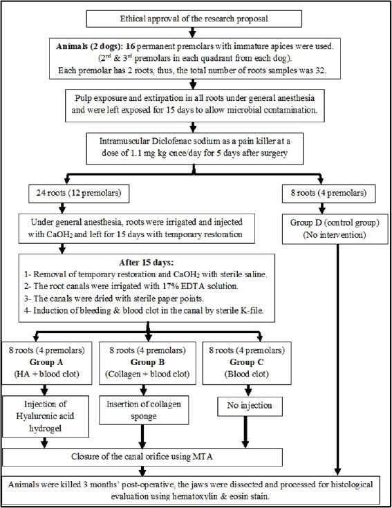 Fig. 1. Flowchart showing the main experimental procedures in the present study. ResultsThe intra-canal pulp tissue regenerative potentialThe pulpal tissue regeneration in Group A (blood clot + HA) was more extensive and occasionally covered nearly the whole root canal. Regular connective tissue with visible blood vessels and sporadic calcified lumps made up the developed tissue. In the pulp core, there were patches of dense collagenous fibrous tissues (Fig. 2A and B). Three of the samples in group B (blood clot + collagen) had empty root canals, while the other five samples had clearly defined connective tissue with established blood vessels, unique cellular components, and newly formed dentin at the pulpal side of the root dentin. Additionally, calcified formations containing entrapped cells were seen (Fig. 2C and D). Only the blood clot samples from group C’s samples displayed empty canals with soft tissue strands and no bone or root resorption (Fig. 3A). On the other hand, five samples from group D (control group) displayed an empty intracanal area (Fig. 3B). There was very little tissue formation next to the canal’s dentin wall in two of the samples. One specimen occasionally showed heterogeneous connective tissue development, with calcified masses distributed across hyalinized regions and fibrous areas (Fig. 3C). While aggregations of red blood corpuscles were found in one specimen (Fig. 3D), no distinguishable cellular features were observed in the intracanal cavities.