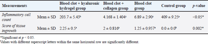 Fig. 4. A: Representative photomicrographs of blood clot + HA group showing apical closure with cementum like tissue, evidence of cementocytes inside the apical openings (arrows) and dense basophilic condensations (blue arrow, B). C: Representative photomicrograph of blood clot + collagen group showing cemntum like tissue inside the root canal (arrow). D: Photomicrograph of blood clot + collagen group dense basophilic condensations (arrow). (H&E. A: 200, B, C and D: ×100). As indicated in Table 1, the treatment groups (A, B, and C) exhibited significantly higher values (p < 0.05) for tissue ingrowth than the control group (D). There were no noteworthy distinctions (p > 0.05) observed among the A, B, and C treatment groups. Group D displayed the lowest tissue ingrowth value (0.0 ± 0.0). DiscussionDue to the lack of an apical stop and the fragile dentin walls, teeth with immature apices pose challenges for standard root canal therapy (Tawfik et al., 2013). Various approaches have been proposed to address these issues, such as calcium hydroxide apexification (Andreasen et al., 2002) and MTA (Holden et al., 2008; Nabeel et al., 2024). As a biologically based substitute that enables more root maturation in length and thickness through the regeneration of essential tissue, RE has attracted a lot of interest lately (Hargreaves and Law, 2011; Talaat et al., 2024). The current study compared the histological efficacy of collagen and HA hydrogel as scaffolds for pulp regeneration in immature, necrotic dog teeth following revascularization. The current study is based on experimental animals. Animal studies have a crucial role in healthcare investigations particularly when meta-analyses of animal studies are conducted (Hooijmans et al., 2014). Additionally, animal models are commonly used to test the efficacy of drugs or techniques before proceeding to clinical trials (Roberts et al., 2002). However, animal studies possess some limitations, including the diversity of the experimental design and study characteristics (Hooijmans et al., 2014) and the poor methodological quality which increases the risk of bias (Kilkenny et al., 2009). One of the most important limitations of animal studies is that there are critically important physiological and genetic differences between humans and animals, which can invalidate the use of animals to study human diseases, and treatments. Animal experimentation generally, are inadequate bases for predicting clinical outcomes in human beings in the great bulk of biomedical science (Akhtar, 2015).