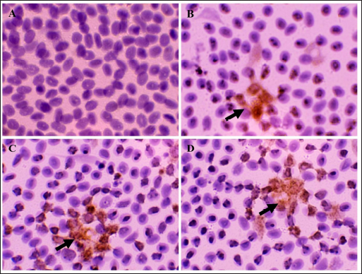 Fig. 1. Immune-expression of CD4+ on cell tube block of ranchu goldfish blood. No CD4+ immune-expression was found in the control without primary antibody (A); CD4+ immuneexpression (arrows) on the surface of lymphocytes of group P2 fed with CMC-Na (B); CD4+ group P3 fed with Power C® (C); group P6 fed with 0.6% BFE (D). Immunohistochemistry of anti-CD4+ antibody, 1000×.