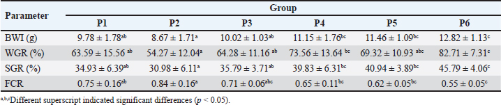 COX-2 is a biomarker for inflammation; an increase in COX-2 indicates inflammatory processes (Olsen et al., 2012). In this study, the COX-2 value in the P1 group was significantly higher than in P6 (Fig. 2). This was due to the α-tocopherol compound. α-tocopherol can reduce the activity of COX-2 and inhibit the synthesis of prostaglandin E2 (PGE2) (Li et al., 2023). Inhibition of PGE2 synthesis reduces the inflammatory response, especially heterophils, which act as the immune system’s first line (Roy et al., 2017). This correlates with the study, indicating a significant decrease in heterophils in the P6-treated group using the highest BFE concentration. A decrease in the value of heterophils reduces the formation of oxidative stress (Guo et al., 2023). Furthermore, the increased immunoreactivity of CD4+ and the decreased levels COX-2 work together to raise the CD4+/COX-2 ratio. The rationale behind this parameter is that a higher CD4+/COX-2 ratio indicates better immunity and vice versa. This is similar to the findings of Ashfaq et al. (2019), who described that elevated expression of CD4+ promotes immunity in teleost fish, while depletion of COX-2 improves the quality of the fish’s immune system. Additionally, Wang et al. (2016b) added that COX-2, involved in prostaglandin synthesis, is a crucial factor in promoting stress in Larmichthys crocea. A decrease in heterophils determines that fewer cytokines are produced, so hepatocyte cells are not stimulated to produce acute-phase proteins. CRP is the acute-phase protein produced during the initial inflammation (Charlie-Silva et al., 2019; Bello-Perez et al., 2020). CRP, an acute-phase protein, helps bacterial agglutination, phagocytosis, and modulation of inflammation during infection (Li et al., 2022). In this study, the CRP results in the P6 group were lower than in P1. Increased immunity helps fish avoid oxidative stress, thus increasing the growth rate. Moreover, Rahman et al. (2023) described that the right concentration of α-tocopherol compounds improves immunity, stress tolerance, and body performance. This study suggests that BFE can be utilized in aquaculture as an immunostimulant through simple methods, such as food coating. However, further research is needed to explore its other positive effects and potential toxicity in aquaculture to ensure the biosafety of using BFE. Enhancing BFE in aquaculture could involve developing new ready-to-use formulations that are easier for farmers to apply. ConclusionThis study demonstrates that coating fish feed with 0.6% BFE significantly enhances the performance and immunity of ranchu goldfish. Notable improvements were observed in growth parameters, including final weight, absolute weight gain, and specific growth rate. Additionally, hematological benefits were evident, with increased RBC counts and CD4+ lymphocytes, alongside reductions in heterophils, CRP, and COX-2 levels, indicating reduced inflammation and oxidative stress. Further research is needed to explore the potential of BFE as a supplement in fish feed to combat various fish diseases and fish species in real-world or laboratory settings and also the effects of long-term utilization of BFE. AcknowledgmentsThe authors acknowledge the Universitas Gadjah Mada for providing the financial support for this study through Final Project Recognition Program, with grant number: 5286/UN1.P1/PT.01.03/2024. Moreover, the laboratory technicians from Integrated Laboratory, University of Muhammadiyah Sidoarjo were acknowledged for their support in conducting the study. Conflict of interestThe authors have no conflict of interest. FundingThis study received financial support from Universitas Gadjah Mada through Final Project Recognition Program, with grant number: 5286/UN1.P1/PT.01.03/2024. Authors’ contributionFLW and ADW designed the study. FLW, YAP, and ADW performed the animal experimentation. FLW formulated, prepared, and preserved the tested compound. FLW and YAP performed data analysis and interpretation. FLW, YAP, and ADW equally contributed to the drafting, revising, and finalizing of the submitted paper. All the authors approved the current version of the paper. Data availabilityAll the data in this study are available within the manuscript. ReferencesAnjur, N., Sabran, S.F., Daud, H.M. and Othman, N.Z. 2021. An update on the ornamental fish industry in Malaysia: Aeromonas hydrophila-associated disease and its treatment control. Vet. World. 14(5), 1143–1152. Anjusha, K.V., Mamun, M.A.A., Dharmakar, P. and Shamima, N. 2019. Effect of medicinal herbs on hematology of fishes. Int. J. Current. Microbiol. Appl. Sci. 8(9), 2371–2376. Ashfaq, H., Soliman, H., Saleh, M. and El-Matbouli, M. 2019. CD4: a vital player in the teleost fish immune system. Vet. Res. 50, 1–11. Bello-Perez, M., Pereiro, P., Coll, J., Novoa, B., Perez, L. and Falco, A. 2020. Zebrafish C-reactive protein isoforms inhibit SVCV replication by blocking autophagy through interactions with cell membrane cholesterol. Sci. Rep. 10(1), 566. Boakye, A., Attiogbe, F. and Emahi, I. 2024. Crescentia cujete fruit shell as green and efficient coagulant for water purification. Clean. Water. 1, 100009. Canosa, L.F. and Bertucci, J.I. 2023. The effect of environmental stressors on growth in fish and its endocrine control. Front. Endocrinol. 14, 1109461. Charlie-Silva, I., Klein, A., Gomes, J.M., Prado, E.J., Moraes, A.C., Eto, S.F., Fernandes, D.C., Fagliari, J.J., Junior, J.D.C., Lima, C. and Lopes-Ferreira, M. 2019. Acute-phase proteins during inflammatory reaction by bacterial infection: fish-model. Sci. Rep. 9(1), 4776. Darnet, S., Serra, J.L., da Cruz Rodrigues, A.M. and da Silva, L.H.M. 2011. A high-performance liquid chromatography method to measure tocopherols in assai pulp (Euterpe oleracea). Food Res. Int. 44(7), 2107–2111. de Andrade Belo, M.A., de Moraes, F.R., Yoshida, L., da Rosa Prado, E.J., de Moraes, J.R. E., Soares, V.E. and da Silva, M.G. 2014. Deleteri