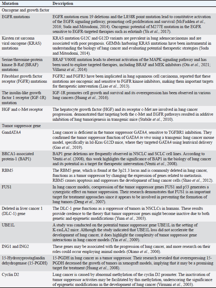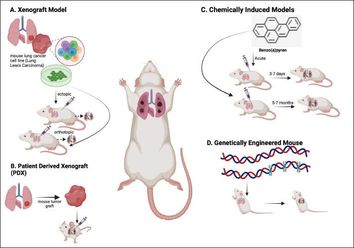 Chemically induced lung cancer animal modelChemically induced cancer animal models use carcinogens to transform normal cells into tumors. Chemically induced animal models have the advantage of mimicking the occurrence of human cancer from the beginning of the carcinogenic process (Liu and Johnston, 2002.) providing a valuable platform to study the pathogenesis, progression, and potential therapeutic interventions for lung cancer. However, the main drawback of this method is that it takes 30–50 weeks to form tumors after using carcinogens (Minicis et al., 2013). Various chemical substances have been employed in Several studies to induce lung carcinomas in animals through intraperitoneal injection such as N-nitroso diethylamine (NDEA) (Çiçek et al., 2022), 3-methylcholanthrene and diethylnitrosamine (DEN) (Zhu et al., 2017). In animal models of adenocarcinoma-type lung cancer, N-nitrosamines such as 4-(methylnitrosamino)-1-(3- pyridyl)-1-butanone (Brown et al., 2007) and DEN (Mervai et al., 2018) have been shown to selectively induce lung adenocarcinoma in animals so that the pathogenesis of lung cancer can be studied. In addition, chemical induction models using substances such as benzo(a)pyrene (BaP) have been developed to induce lung cancer in mice, providing insight into the effects of these carcinogens on lung tumourigenesis (Wang et al., 2021). Urethane, a chemical carcinogen present in tobacco smoke, has been shown to induce lung tumors in mice by causing activating mutations in Kras (Minowada and Miller, 2009). Cell lines for lung cancer induction in animal modelsA xenotransplantation paradigm in which cancer cell lines are injected into immunodeficient mice is known as the CDX model (Brennecke et al., 2014). For this aim, the NSCLC adenocarcinoma cell line A549 has been widely employed, created an orthotopic lung cancer animal model by implanting a variety of cells into BALB/c nude mice, demonstrating the adaptability and significance of the A549 cell line (Lee et al., 2010). Furthermore, a lung cancer animal model in nude mice has been established using the human large-cell lung cancer cell line H460 (Ye et al., 2016). Furthermore, the C57BL/6 mouse-derived murine lung cancer cell lines LLC and CMT167 are crucial for researching the tumor microenvironment and determining how sensitive lung cancers are to PD-1/programmed cell death ligand 1 (PD-L1) antibody blocking (Du et al., 2016). PDXs for lung cancerPDX models have become an invaluable tool in lung cancer research, providing a platform to study tumor biology, test therapeutic regimens, and identify predictive biomarkers. These models involve implanting patient-derived tumor tissue into immunocompromised mice to create xenografts that mimic the characteristics of native tumors, successfully created a broad panel of patient-derived tumor xenografts for NSCLC, despite the considerable time and distance between clinical and animal facilities, providing a stable and reliable preclinical model for human lung cancer research (Ilié et al., 2014). This PDX model recapitulates the histopathology and molecular diversity of NSCLC, offering a platform to study disease heterogeneity and test personalized treatment approaches. Furthermore, PDX models have been instrumental in predicting effective therapies for lung cancer, demonstrating the utility of PDX models in predicting effective heparanase-based therapies for lung cancer, highlighting the relevance of these models in guiding treatment strategies (Katz et al., 2018). Additionally, it emphasizes the clinical significance of PD-L1 in patients with lung cancer using PDX models, demonstrating the ability of these models to reproduce the biological characteristics of human cancers (Ma et al., 2016). Genetically engineered mouse model for lung cancerResearch on lung cancer has derived greatly from the use of genetically engineered mice models (GEMMs), which offer an invaluable platform for examining the development, spread, and effects of treatment. Animal models of genetically engineered lung cancer are produced by modifying (adding/removing) genes to produce desired functional alterations. Lung cancer that is both universal and unique to the pau will be the outcome of the change (Zhao et al., 2000). The KrasG12D/+ (Kirsten rat sarcoma viral oncogene homolog) mouse model of lung cancer is a well-known GEMM for the disease. It is a p53 Frt/Frt model in which conditional mutations in the p53 tumor suppressor gene and the K-ras oncogene cause adenocarcinoma to develop in the mouse lung (Barck et al., 2015). Utilization of GEMMs with conditional mutations in the K-ras oncogene and p53 tumor suppressor gene to induce lung tumors can exert circadian rhythm disruption effects on lung tumorigenesis (Papagiannakopoulos et al., 2016) and highlight histopathological changes using micro-CT imaging and automated analysis (Barck et al., 2015). Another method eliminates the SWI/SNF ATPase subunits BRM and BRG1 in promoting lung cancer development in GEMM. This study highlights the histopathological changes associated with lung cancer progression in GEMMs. Mutations in growth factors such as SP-C-IgEGF, SP-C-cMyc, and SpC-IgEGF will result in adenocarcinoma GEMM changes and provide insight into tumor evolution and progression (McFadden et al., 2016). Other GEMM studies can be seen in Table 2. Molecular carcinogenesis of lung cancerThe development of lung cancer involves a complex process known as molecular carcinogenesis, which includes genetic mutations, epigenetic changes, and interactions with the tumor microenvironment. Gaining a comprehensive understanding of these mechanisms is essential for the development of highly effective preventative and treatment strategies. Angiogenesis and vasculogenesisAngiogenesis is a common, complex physiological process that is managed by certain molecules that the body produces. Endogenous local or systemic biomolecular signals synchronize the actions of smooth m