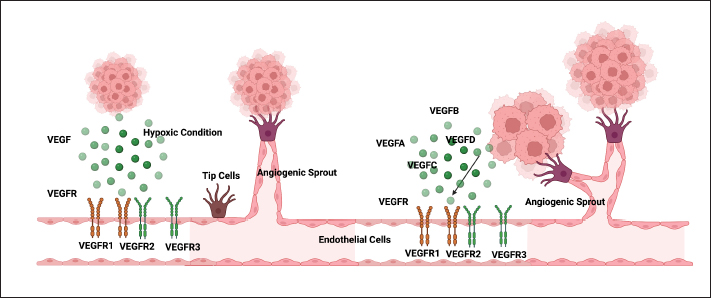 Sprouting angiogenesis is the first stage of vasculogenesis. Tumor cells, the microenvironment, and the extracellular matrix (ECM) are all involved in this pathway. Destabilization of endothelial-pericyte connections (maintaining the integrity and maintenance of blood vessels) is the first step in the sprouting angiogenesis stage. The mesenchymal-endothelial transition that endothelial cells go through improves their ability to migrate, invade, and proliferate. Mesenchymal-endothelial transition degrades the ECM and basement membrane with activated proteases (such as MMP), opening migration, and proliferation pathways. The lumen of blood vessels is formed by the polarization of endothelial cells (Urbich and Dimmeler, 2004; Lugano et al., 2020). This event provides a proangiogenic signal—the tip cell becomes invasive and motile. Endothelial cells respond to VEGF signals by expanding filopodia to form new blood vessels along the vascular bed. Endothelial cells in the sprouting angiogenesis stalk (stalk cells) have the potential to proliferate. The proliferative potential of stalk cells forms tubules, allowing expansion to form new blood vessels (Norton and Popel, 2016). The next step is intussusception microvascular growth. The intussusception microvascular growth mechanism begins with the division of the blood vessels into two new blood vessels, and a transvascular connective tissue column is formed within the lumen of the blood vessel, called a tissue pillar. Transendothelial cell bridges are formed subsequent to the induction of endothelial cells from the opposing wall. The endothelium layer forms as a result of the arrangement of the interendothelial connections. Interstitial pillars are created to reinforce the bridge, and mural cells are enlisted to line the newly created interstitial walls (Burri et al., 2004; Ali et al., 2019). There is vascularogenic mimicry. Tumor cell differentiation is the basis for this process. A matrix network like that of vasculogenesis is created by this process. Red blood cells and plasma make up this structure, which aids in blood circulation. Regardless of angiogenesis, endothelial cells that engage in vasculogenic mimicry can serve as a supplementary circulatory system for tumor cells. Vasculogenic mimicry is caused by low oxygen levels, the release of ECM components, and the activation of transmembrane Metalloproteinase (MP) (Luo et al., 2020). MMP, integrins, and VEGF are a few biomolecules involved in tumor cell angiogenesis. In addition to being the primary source of pathological angiogenesis, VEGF also causes inflammation, rheumatoid arthritis, diabetic retinopathy, and cancer (Mukhopadhyay et al., 2004). The Zn structure is essential to a class of endopeptidases known as MMPs. MMP plays a role in the disintegration of ECM macromolecules (Wang and Khalil, 2018). The role of VEGF in angiogenesisThe primary modulator of blood vessel development is homodimeric glycoprotein VEGF, sometimes referred to as VEGF-A. By starting the proteinase cascade that results in the creation of plasmin and MMP, VEGF generates feedback for VEGF activity (Liu et al., 2023). Some of the growth factors that may promote the synthesis of VEGF include platelet-derived growth factors (PDGF), fibroblast growth factors (FGF), epidermal growth factors, tumor necrosis factors (TNF), transforming growth factors, interleukin-1 (IL-1), and the hypoxic state of cells (Bao et al., 2009). Increased endothelial cell migration, increased endothelial cell mitosis, increased methane monooxygenase activity, increased αvβ3 activity, blood vessel lumen layout, and more are all related to VEGF’s function in angiogenesis, chemotaxis for granulocytes and macrophages, as well as indirect vasodilation via endothelial-derived relaxing factors or nitric oxide (NO) release (Lamalice et al., 2007). As a crucial modulator of normal physiological angiogenesis, VEGF expression abnormalities are a key marker of the illness process. Pathogenesis, which includes neoplasia and inflammatory diseases, is influenced by VEGF. Increased VEGF expression has been seen in neoplastic cell biopsies. In a variety of human cancer types, VEGF is known to be the starting point for carcinogenesis and disease development (Ceci et al., 2020). Neoplastic cells are essential for the formation of VEGF; without a sufficient vascular supply, they will not proliferate because they will not have enough oxygen and nutrients. As a key player in tumor angiogenesis, VEGF promotes the formation of new blood vessels from surrounding capillaries, giving tumors access to the nutrients and oxygen they require to proliferate (Lugano et al., 2020). The absence of adequate vascularization in neoplasm cells causes a hypoxic environment, which, in turn, triggers new vascularization. The tumor’s state also alters the microenvironment, resulting in elevated growth factor levels and neovascularization triggers tumor growth (Chen et al., 2023). The growing distance of dense cancerous cells from the nearest blood arteries causes the cells to undergo hypoxia. Von Hippel–Lindau does not suppress hypoxia-inducible factor-1 (HIF-1) or scatter in hypoxic circumstances (Kaelin, 2004). Because of this, HIF-1 can dimerize and attach to the VEGF gene promoter, which stimulates the production of VEGF. VEGFR on endothelial cells then receives this VEGF, potentially causing angiogenesis (Fig. 3).