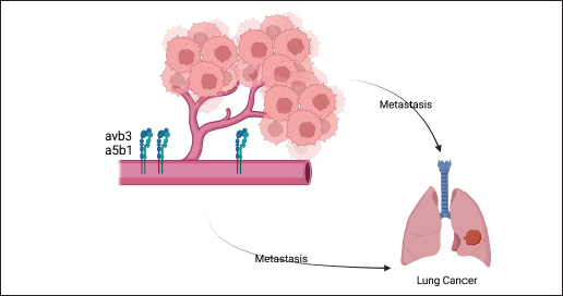 Fig. 4. The interaction of integrins αvβ3 and α5β1 with ECM regulates metastatic activity. The expression of integrin αvβ3 and α5β1 will significantly increase during the process of angiogenesis. Integrins will bind to the ECM and enhance cancer cell adhesion. Cancer cell adhesion will help cancer cells move to blood vessels that supply blood to cancer cells so that cancer cells can move to other organs suitable for growth.