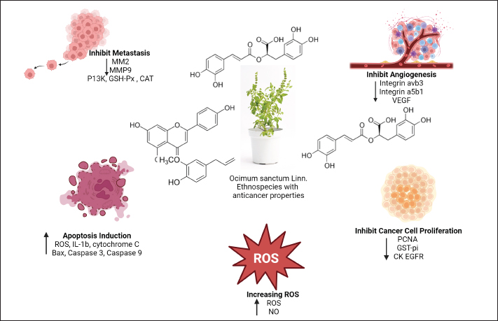 OS leaves, seeds, stems, fruits, flowers, and roots are almost all used as extracts or medications in traditional herbal remedies. However, in Indonesia, the leaves are the most commonly used herb in medicine, followed by the seeds, aerial parts, and entire plants. Similar to previous worldwide ethnobotanical studies conducted in Ghana, Lebanon, Morocco, and Turkey, an ethnobotanical reference study found that leaves were the main dominant plant component used in the composition of traditional treatments. Several studies have been carried out to comprehend OS’s impact on cancer. Ethanol extract of OS (EEOS) has been studied in vivo and in vitro for its anticancer properties. To determine the molecular target of EEOS, a study was carried out on a rat model of MNN-induced stomach carcinogenesis. As genes that promote proliferation and angiogenesis, the study found that eugenol, ursolic acid, and carvacrol extracted from the OS leaf were able to lower the expression of PCNA, GST-pi, BCl-2, CK, and VEGF in rats with stomach carcinogenesis caused by MNN. According to this discovery, substances also raise the expression of apoptosis-inducing genes such as caspase 3, cytochrome C, and Bax (Manikandan et al., 2007). The study also revealed that the expression of EGFR, Kelch-like ECH-associated protein 1 (KEAP1), and β2- adrenergic receptor (β2-AR) was successfully inhibited by quercetin, rutin, and tannic acid that were separated from defatted OS seed extract. The G protein-coupled receptors, which are seven transmembrane receptors, including the β2-AR, are involved in the development and spread of oral cancer. It was discovered that norepinephrine-stimulated β2-AR enhanced IL-6 production and cell proliferation in oral squamous cell carcinoma cell lines (Sharma et al., 2020). The lung is one of the tissues with high levels of NRF2 expression where detoxifying processes take place. It interacts with KEAP1, its own negative regulator, under normal physiological settings. The oxidative stress sensor KEAP1 mediates Nrf2 degradation (Bauer et al., 2013). According to research on an A549 human lung cancer cell, EEOS raises TUNEL 1 positive and the apoptotic sub-G1 in A549 cells, suggesting that enough DNA has been ruined by DNA fragmentation. According to a different study, EEOS’s polyphenols and flavonoids cause A549 cells to separate from the ECM, which lowers the cells’ viability. Furthermore, the capacity of EEOS to induce apoptosis raises the quantity of intracellular reactive oxygen species (ROS) and the interference activity of superoxide dismutase (SOD) and GPα (Fig. 5) (Wihadmadyatami et al., 2019). In A549 cells, angiogenesis is inhibited by downregulating integrin αvβ3, a5b1, MMP-2, and MMP-9 (Wihadmadyatami et al., 2020; Kustiati et al., 2022). The anti-metastasis action of EEOS was demonstrated to be mediated by inhibition of phosphatidylinositide 3-kinase (P13K) in research conducted on NCI-H460 NSCLC cells (Kwak et al., 2014). According to Utispan et al. (2019), rosmarinic acid in the extract of EEOS may reduce the activity of MP after preventing cell invasion (Utispan et al., 2020) (Fig. 5). The (-)-rabdosiin of EEOS has been shown to stimulate antiproliferation in human cancer cell lines in another investigation (Flegkas et al., 2019). Applying EEOS to human breast cancer cells has the potential to increase the expression of P53 and Bid (BH3 interacting domain death agonist) as well as the Bax/Bcl2 protein ratio (Manaharan et al., 2013). Singhal et al. (2017) reported that vicenin-2, a flavonoid derived from tulsi (holy basil), inhibits the proliferation of prostate cancer (CaP) and increases the antitumor properties of docetaxel in vitro and in vivo when compared to other active substances of OS Linn, such as erientin and luteolin. Vicenin-2 raises p53 levels, decreases hTERT, PCNA, and pRB, and suppresses pEGFR, pAkt, and the mTOR signaling mediator Pp70S6K (Singhal et al., 2017). Inducing apoptosis, preventing cell invasion, limiting proliferation, restricting metastasis, and inhibiting angiogenesis are among the functions of OS in lung cancer (Fig. 5). Multiple investigations have indicated that OS’s ability to fight cancer is significantly influenced by intrinsic mitochondrial apoptosis. Cytochrome C is released into the cytosol when mitochondrial malfunction brought on by the cleavage of Bid by the intrinsic apoptosis pathway triggers apoptosis. Apoptotic protease activating factor-1, or Apaf1, is an adaptor protein that is activated when cytochrome C in the cytosol attaches to procaspase. This process creates the apoptosome, which in turn attracts procaspase 9. Apoptosis is brought on by the activation of caspase-9 and caspase-3, which causes cell death and DNA fragmentation, among other apoptotic hallmarks (Manaharan et al., 2013, Manaharan et al., 2014; Wihadmadyatami et al., 2019, 2020). Table 4 provides a summary of the OS’s function. Table 4. The role of OS ethanolic extract to prevent cancer metastasis.