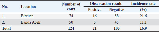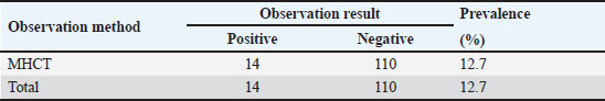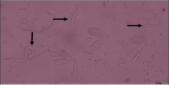 Fig. 1. Sheathed microfilaria (L1) of S. digitata (40x) (arrow). Table 2. Microfilaria prevalence in Aceh cow blood analyzed with MHCT (n=124 cows).