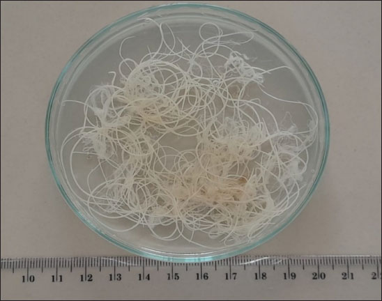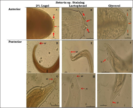 Fig. 2. Setaria sp. worm (40x). Table 3 showed that the incidence rate of Setaria sp. worm in Aceh was 16.9%. The incidence rate in this research is lower compared to the research performed by Shin et al. (2002) in Korea where the prevalence rate of Setaria sp. in cows was 70%. Although these worms grow into adulthood in the abdominal cavity and thus mostly are not dangerous for livestock, serious pathogenic results may occur in animals such as goats, sheep, and horses where the Setaria sp. larvae may migrate randomly into the central nervous system. The difference in nematode prevalences in several territories is influenced by several factors: the infectious agent, age, sex, breed, feed, and reading management. The rearing and enclosure management by the farmers and overall farm management greatly influence parasite infection prevalence (Tolistyawati et al., 2016). Blood is a body liquid that distributes oxygen to all body tissue and sends the nutrition needed by the cells. This allows Setaria sp. worm larvae to grow in their host’s body. Definitive diagnosis in setariosis cases can be done by complete ophthalmic testing, showing worm movement inside the eye, or by Knott test method to detect Setaria microfilariae (Jayathilake et al., 2019). Knott test is a technique to detect microfilaria by hemolysis and blood sample concentration to detect Setaria species microfilariae (Rafee and Amarpal, 2016). The morphological observation to identify Setaria sp. worm found in the peritoneum cavity of Aceh Cow from Banda Aceh and Bireuen, Aceh, was performed by glycerol, Lugol 2%, and lactophenol solutions (Fig. 3). The morphological observation of the worms with lactophenol staining solution in this research (Fig. 3D, E, H) resulted in clearer and easier-to-identify worm morphology, but the sample did not last as the worm would be damaged. Whereas the use of Lugol 2% (Fig. 3A, D, G) and glycerol (Fig. 3C, F, I) staining solution took a longer time to be clearly seen but lasted longer and the morphology appeared clear. According to Asarina and Haeruni (2019), the three solutions have each’s advantages and disadvantages in identifying worm morphology. Glycerol solution is hygroscopic so it absorbs water molecules. Samples added with glycerol in all concentrations are proven to last longer and not dry. Glycerol is a colorless odorless viscous chemical often used in drug formulation. Glycerol is generally used for preservation media or long-term storage as well as a medium to move microorganisms (Seniati et al., 2020). Glycerol can be used as a medium because glycerol can protect antimicrobial activity by improving the structural stability of the microbe’s natural protein thus preventing the protein from damage from thermal process and aggregation (Setiaji et al., 2015). Lugol solution is often used in microscopic parasite observation, among them is worm morphology observation. Lugol solution staining gives a clear background with a yellow color on the worm (Hastuti and Haryatmi, 2021). Lactophenol staining gives a clear view of worm morphology where the worm turns transparent, but this staining may lower the elasticity thus hindering the identification process (Beraldo and Pascotto, 2014) or even at times damaging the worm in a moderately long storage span (Hanafiah et al., 2023). From Figure 3, the anterior and posterior parts of S. digitata by several staining solutions could be seen. Figure 3A–C depicted the anterior of S. digitata, and Figure 3D–I showed the anterior part stained by Lugol 2%, lactophenol, and glycerol. The anterior part (Fig. 3A–C) showed that S. digitata worm has peribuccal crown with central “helmet” at the end of its head and triangle-shaped lateral labia (LL). Figure 3D–I showed that the tail ends with a smooth knob with oval lateral appendages (ALs). Differences with Setaria sp. worm morphology could be seen at the anterior tip. The anterior tip of S. digitata worm is round with two similar projections. The posterior tip of S. digitata has a smooth or slightly rough knob/dull tip with surface papilae (Rodrigues et al, 2021). Setaria sp. morphology observation revealed that S. digitata morphology differs between sexes. The female worm has a peribuccal crown or “helm” in the anterior tips shaped like a triangle with two projecting thorns showing the dorsal projection (DP) and ventral projection (VP) at the peribuccal crown. The posterior of the female S. digitata has a smooth round terminal knob with ALs. Meanwhile, the male S. digitata has a similar anterior to the female worm and a wavy cuticle. The posterior end of the male worm has a thick and sturdy right side with a narrow proximal end while the left spicula has a stem and a rod (Sundar and D’Souza, 2015). Table 3. Setaria sp worm incidence in several observation sites.
