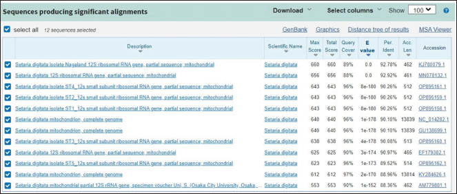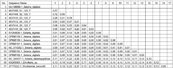 Fig. 5. The Blast result of 12S rRNA gene nucleotide from Setaria sp. worm samples from Aceh cows. Table 4. The genetic distance of S. digitata in Aceh cow.