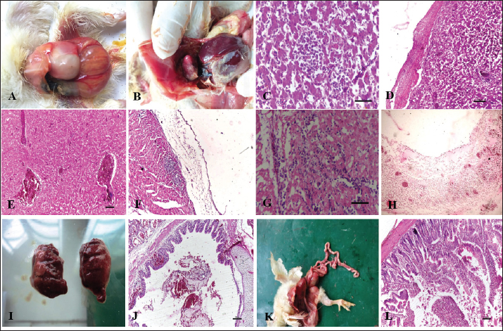 Fig. 1. Gross and Histopathological changes in chicks affected with colibacillosis. A: Pendulous abdomen resulting from distended yolk sac. B: Thin fibrin layer attached to liver and heart. C: Cellular swelling, individualization of hepatocytes along with distortion of hepatic cords. (H.E) D: Thick fibrin layer attached to mildly thickened liver capsule along with infiltration by heterophils. (H.E.) E: Liver section showing severe vascular and sinusoidal congestion. (H.E) F: Section of heart from colibacillosis affected chicken revealing thickened pericardium along with infiltration by heterophils. (H.E.) G: Section of heart from colibacillosis affected chick revealing myocardial degeneration along with infiltration in myocardium. (H.E.) H: Section of air sac revealing necrosis, edema and infiltration. (H.E) I: Lungs from colibacillosis affected birds revealing varying degrees of congestion. J: Section of Lung revealing presence of hemorrhagic exudate in primary bronchus. (H.E) K: Broiler chick affected with colibacillosis revealing congestion of intestines. L: Section of intestine revealing degeneration and desquamation of villus epithelium and heterophils infiltration. (H.E). Salmonellosis: Grossly bronze discoloration of the liver was noticed with numerous necrotic greyish patches and reddish hemorrhagic foci distributed uniformly on the surface (Fig. 2A). Microscopic lesions in liver included diffuse coagulative necrosis of hepatocytes and focal area of heterophil infiltration (Fig. 2B). In some cases, isolated foci of necrosis with infiltration of leucocytes mostly in portal triads and perivascular areas was noticed (Fig. 2C). Grossly in heart, elevated greyish white nodular areas were observed on the myocardium more predominant on the ventricular region (Fig. 2D). Microscopic lesions in heart included thickening of pericardium (Fig. 2E) and necrotic focal areas in myocardium with infiltration of mononuclear cells (Fig. 2F). Grossly, the intestines appeared congested with hemorrhages mostly on the mucosal surface. In severe cases, swollen and foam-filled caeca was seen. (Fig. 2G) Microscopically, mucosal congestion, degeneration, and desquamation of lining epithelium and mild to moderate infiltration of heterophils and mononuclear cells in the lamina propria of the villi were noticed (Fig. 2H, I).