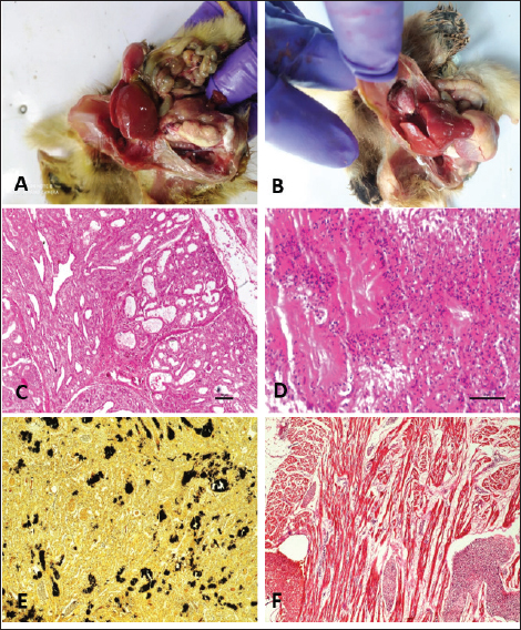 Fig. 4. Gross and Histopathological changes in chicks affected with Visceral gout. A: Chick affected with systemic gout revealing white chalky Urate deposits on kidneys. B: Chick affected with systemic gout revealing white chalky Urate deposits on heart. C: Section of kidney from gout affected chick revealing cystic dilatation of renal tubules (H.E) D: Section of kidney from gout affected chick revealing urate crystal deposition as pink radiating amorphous material surrounded by a narrow zone of inflammatory cells more clearly. (H.E) E: Section of kidney from gout affected chick revealing black coloured urate crystals. (De Galantha’s Stain) F: Section of heart from gout affected chick revealing degenerated myocytes, leucocytic infiltration and mild urate deposition. (H.E). DiscussionEarly chick mortality in chicks is considered as one of the major problems of the poultry industry caused by various disease conditions like Omphalitis, colibacillosis, enteritis, salmonellosis, aspergillosis, visceral gout, and some unidentified miscellaneous conditions. In the present study, colibacillosis was seen as the main contributor of mortality (58.1%) in the broiler chicks followed by salmonellosis (32.3%), aspergillosis (6.4%) and visceral gout (3.2%). The results strengthen the fact that colibacillosis is one of the principal causes of morbidity and mortality in the poultry industry. Earlier studies also reported colibacillosis as the predominant disease causing mortality in young chicks (Amin et al., 2017; Amin et al., 2020; Shah et al., 2020; Wani et al., 2020). Prevalence of salmonella in chicks was recorded as 32.3% with 23.5% in the age groups of 0–7 days and 8.8% in 8–14 days. The reasons for the higher prevalence of salmonellosis in chicks is because of immature immune system, weaker gut flora, rapid disease progression, higher susceptibility to environmental stress, and the vertical transmission of the disease. Similar findings were also reported by Alam et al. (2003) and Sikder et al. (2005) who observed a 23.8% and 23.5% prevalence of salmonellosis in chicks, respectively. However, the lower prevalence rate of 5.88% of Salmonella was reported by Jinu et al. (2014) from chicks in Bareilly, Uttar Pradesh. This difference is due to geographical variation. Aspergillosis was reported with a prevalence rate of 6.4% in the age groups of 0–7 days and 1.3% in the age group of 8–14 days. The reasons for the higher prevalence of aspergillosis in young chicks could be because of an underdeveloped immune system, smaller respiratory tract, weaker physical barriers, exposure to contaminated environments and inadequate thermoregulation. These findings are in concordance with the previous reports (Malay et al., 2005; Sultana et al., 2015). Gout revealed a case prevalence of 3.2% in chicks up to 2 weeks of age. The proportionate mortality due to gout was higher at 1.7% in the age groups of 8–14 days followed by 1.5% in the age groups of 0–7 days. The findings of our study are in accordance with the observations of Ali et al. (2018) and Yadav et al. (2020) who also reported similar mortalities by gout in broiler chicks. Grossly in cases of colibacillosis, yolk sac was distended resulting in pendulous abdomen, superficial blood vessels of the sac were congested; livers were typically covered by a thin layer of fibrin with some of the birds revealing thick fibrin layer adhered with liver parenchyma and adjacent thoracic cavity giving a characteristic bread and butter appearance to the liver. Histopathological examination of the liver revealed cellular swelling, individualization of hepatocytes along with distortion of hepatic cords, focal areas of cellular infiltration, and thickened capsules with the presence of a large amount of fibrin and heterophils. The gross and histopathological findings in the liver of the cases of colibacillosis were in concordance with the earlier reports (Kumari et al., 2013; Abalaka et al. 2017; Shah et al., 2019). Similarly, the gross and histopathological findings in the heart, intestines, and lungs are in agreement with the earlier studies (Yaqub et al., 2023; Shafi et al., 2024). In the cases of salmonellosis, grossly bronze discoloration of the liver, elevated greyish-white nodules on heart, congested and hemorrhagic intestines were noticed. Histopathological findings were mostly dominated by necrosis, mononuclear cell infiltration, and desquamation of lining epithelium. Similar findings were also reported by Nazir et al. (2012); Kumari et al. (2013); Yadav et al. (2020); Kashani et al. (2021) and Janwari et al. (2022). Aspergillosis resulted in the development of small white nodules on lungs and air sacs which were microscopically characterized by a central necrotic area with infiltration of heterophils, macrophages, epithelioid cells, and giant cell formation. Similar findings were also reported in cases of aspergillosis earlier (Olias et al., 2010; Sultana et al., 2015; Shoukat et al., 2018). Visceral gout resulted in the deposition of chalky white material on kidneys, heart, and other organs which was microscopically characterized by pink amorphous radiating material surrounded by a narrow zone of inflammatory cells and occasional infiltration of heterophils and mononuclear cells. Similar gross and histopathological findings were reported earlier (Ali et al., 2018; Namratha et al., 2019; Yadav et al., 2020; Rafiq et al., 2024). ConclusionIn conclusion, the main contributor to mortality in chicks was colibacillosis followed by salmonellosis, aspergillosis, and gout with overall mortality in the flocks at 1.7%, with 1.6% in the first week and 1.8% in the second week of life. AcknowledgmentThe authors are thankful to the Vice Chancellor and Director Education, SKUAST. Kashmir for providing the necessary facilities for the smooth conduct of this research. Conflict of interestThe authors declare that they have no known competing financial interests or personal r