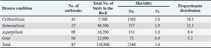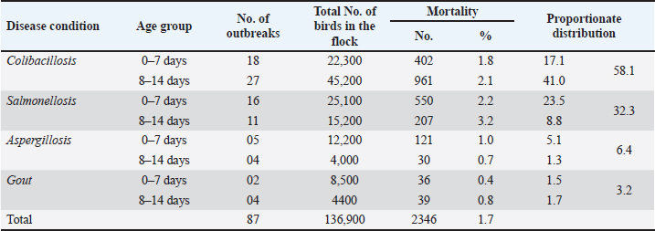 Table 2. Age group wise mortality and prevalence of various disease conditions causing ECM among broiler chicken.