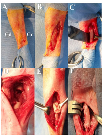 Fig. 1. Surgical procedure and the treatment groups. (A) Left radius prepared aseptically for surgical operation. (Cd) Caudal (Cr) Cranial. (B) 4-cm incision was made craniomedially in the skin of the left forelimb, and the radius bone was exposed by dissecting the surrounding muscles. (C) Exposed left radius. (D) Group I (the control group) was left empty. (E) Bone defect is filled with a Surgispon. (F) Bone defect is filled with a weight ratio 75/25 nHAp/CS composite wrapped with a Surgispon. Following the surgical procedures, the rabbits were transferred to a recovery room, where they remained until they regained complete consciousness. The skin sutures were removed on the 7th postoperative day. During the experiment, the rabbits were fed ad libitum. All rabbits were sacrificed at 6 and 12 weeks after surgery for radiographic analysis, gross examination, CT scan, and histopathological examination. Radiographic analysisImmediately following surgery, using exposure factors (2.5 mAs, 40 kVp, and 50 mA), mediolateral radiographs of the radius using an X-ray machine (Pox-300 BT, Toshiba, RotanodeTM, Japan) were taken. The radiographic examination was performed at 6 and 12 weeks postoperatively. The results were scored using the Lane–Sandhu system (Table 1) by two separate experts who were unaware of the different groups (Zhao et al., 2021). Gross examinationAfter animals were sacrificed, the radius and ulna were harvested, and the soft tissue was removed at the 6th and 12th weeks postoperatively. The macroscopic observation of the bone defect was conducted and photographed. The harvested radius and ulna bones were examined and scored in a blinding manner using a scoring system, as previously described by (Parizi et al. (2013), considering the presence of bridging bone, which indicated a complete union, and were assigned a score of +3. In addition, the presence of cartilage, soft tissue, or cracks within the defect was assessed, indicating a potentially unstable union and assigning a score of +1 or +2. Finally, if there is complete instability at the defect site, indicating no union, a score of 0 was assigned. CT scanThe harvested radius and ulnar bones of rabbits in each group were scanned at the 6th and 12th weeks using a GE Lightspeed VCT 64 CT device (WIPRO GE HEALTHCARE PVT. LTD., Karnataka, India). Images were reconstructed in coronal and three-dimensional (3D) and visualized using the RadiAnt DICOM viewer program (Medixant, Poznan, Poland). All radial bones were scanned with an energy value of 140 kV and 50 mA. The assessment of new bone formation at the defect site was conducted by two senior orthopedic specialists who were blinded using Cheung’s scoring method (Table 2), as described previously by Ibrahim et al. (2016). Histopathological examinationTo perform histological evaluation, bone samples containing the defect were collected using a slow-speed saw. The bone samples were promptly placed in a 10% neutral buffered formalin solution for 48 hours. The samples preserved in formalin were then decalcified using mixtures of hydrochloric acid 10% and formic acid 10% for 3 weeks, dehydrated in gradually ascending ethanol, cleared in xylene, and embedded in paraffin wax. The paraffinized samples were cut in longitudinal serial slices using a microtome (Leica RM 2155, England), with a thickness of 5 μm from the central regions of each sample. These slices were then subjected to staining using hematoxylin and eosin (H and E) and Masson’s trichrome. The sections were evaluated and scored by two pathologists using Emery’s scoring system, with the evaluation process being blind (Table 3) (Emery et al., 1994). Statistical analysisThe data provided was presented in the form of means and standard deviations. The statistical software GraphPad Prism version 10.3.0 (GraphPad Software, La Jolla, CA, USA) was utilized for data analysis. Differences are regarded as significant when the p-values are less than 0.05. They are considered highly significant when the p-values are less than 0.01 and less than 0.001. Table 1. Lane–Sandhu radiographic scoring system.