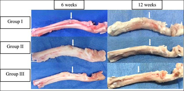 Fig. 4. Gross examinations were performed in groups I–III at 6 and 12 weeks postoperatively, with white arrows indicating defect locations.