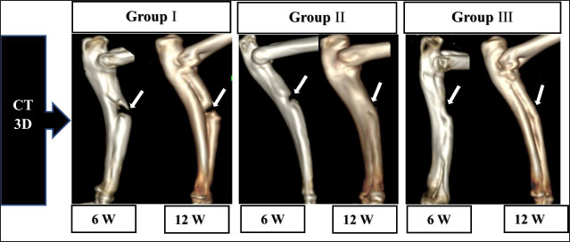 Fig. 5. Three-dimensional CT (CT) images were obtained for groups I–III at 6 and 12 weeks postoperatively. The stage of healing was indicated by the white arrow mark on the 10-mm-induced full-thickness segmental defect at the mid-shaft of the radius in each image. Figure 3D displays the statistical findings from the use of Emery’s scoring system for histopathological examinations. These results did not reveal any noticeable statistically significant variation between the groups 6 weeks postoperatively. The quantitative histopathological results for groups II and III at 12 weeks post-surgical operation, as shown in (Figure 3D), proved that both groups were superior to group I. In addition, a statistically significant difference was observed, with a p-value of less than 0.01. DiscussionGelatin is commonly employed in the field of biomedicine. In its denatured state, gelatin is reserved of tripeptide sequences called RGD (arginyl–glycine–aspartic acid). These sequences play a role in facilitating cellular interactions with the ECM. This biomimetic peptide demonstrates improved cellular adhesion, differentiation, and proliferation (Kurian et al., 2022). The hemostatic gelatin sponge has shown considerable promise as a scaffold for bone tissue engineering, as evidenced by various studies conducted in vivo and in vitro. These investigations provide in vitro outcomes, which include good biodegradability and biocompatibility, osteogenic differentiation, and the migration of preosteoblasts, while in vivo data suggest properly directed bone regeneration (Rohanizadeh et al., 2008; Sohn et al., 2010; Kuo et al., 2016; Ashour et al., 2018; Wang et al., 2019; Wähnert et al., 2021).