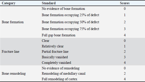 Ethical approvalThe experimental protocol was approved by the Zagazig University Committee of Animal Welfare and Research Ethics. ResultsRadiographic findingsThe mediolateral radiograph was obtained immediately following the surgical procedure. The radiographs in group I were radiolucent, while those in group II were marginally radiopaque. Group III radiographs serve as illustrations of radiopaque density (Fig. 2). Following 6 weeks post-implantation, the radiographs of the segmental bone defect in group I showed a lack of bone union and considerably reduced radiopacity when compared to the neighboring healthy bone, indicating that bone regeneration is limited. Compared to group I, groups II and III showed a significant reduction in the extent of defects due to enhanced bone regeneration but without identifying the bone union (Fig. 2). Table 3. Histological examination Emery’s scoring system.