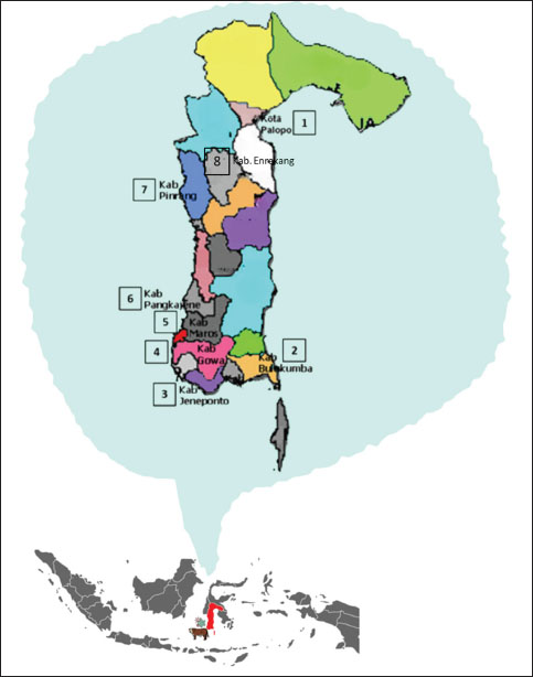 Fig. 1. Maps showing the Sulawesi islands in Indonesia and the locations of examined regency (Sumber: makassar.bpk.go.id).