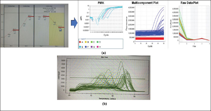 Fig. 3. (a) Real-time RT-PCR amplification by serotype-specific primers and probes 3D gene (b) Melting curve analysis optimization reaction. Table 1. Specimens sample in RT-PCR.