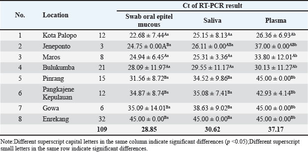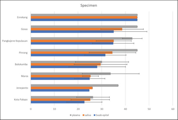 Fig. 4. Mean value of Ct result from specimen sample using RT-PCR (3D). Our results showed that the mean Ct value of samples from 8 districts in South Sulawesi Province were 28.90; 30.62; and 37.17 of FMD PCR positive for the oral mucosal epithelial swabs, saliva, and blood plasma specimens, respectively. Almost similar and sensitive results observed compared to positive controls from the Farma Veterinary Center used (ct=29.10) were oral mucosal epithelial swabs. These results indicate that the sensitivity value of oral mucosal epithelial swab specimens is the same as positive controls, even more sensitive, and also compared to saliva or blood plasma specimens. The ANOVA analysis showed significance (p > 0.05) between specimens (Table 1; Fig. 4). DiscussionThe virus called FMD is highly contagious. It is also a serious transboundary animal infection. Because of its severe impact on trade and manufacturing, FMD can have crippling socioeconomic impacts (Alexanderson, 2002; Callahan et al., 2002). The livestock industry suffers significant losses from FMD due to the high costs of prevention or control methods, such as mass vaccination campaigns and/or culling of infected animals, as well as the clinical impact of the disease on milk and beef production. Vesicular lesions, associated with fever, lameness, drooling, and anorexia in clinically ill cattle, can be found on the mouth, feet, and udder (Paixão et al., 2008; Directorate General of Livestock and Animal Health Service, 2022; Sutawi et al., 2023). The cattle farming sector in South Sulawesi continues to grow, even sending superior cattle to many other provinces in Indonesia. South Sulawesi has been designated as a national cattle breeding center by the Ministry of Agriculture. This decision was not made lightly; many factors must be considered, including a supportive agro-climate and the farming traditions of the population, which have been passed down from generation to generation (Ministry of Agriculture of the Republic of Indonesia, 2022). It is critical to do an early study and identify this disease using the appropriate detection technology in order to implement a speedy control approach. The correct identification procedure is employing the appropriate sample and method to produce accurate results. Cattle in South Sulawesi exhibiting FMD symptoms, as reported by farmers to the Maros Veterinary Center, were sampled using a sampling technique aiming at clinical symptoms of FMD in cattle. FMDV-infected animals typically develop lesions on the tongue, snout, oral cavity, coronary band, and teats. Other typical symptoms include fever, poor appetite, weight loss, hypersalivation, depression, growth retardation, and considerably decreased milk production, which may last even after recovery (OIE, 2018). On the other hand, diagnosis based on clinical symptoms is problematic because many diseases have similar symptoms; therefore, laboratory confirmation is required for each suspected FMD patient (Wong et al., 2020). Several approaches can be used to confirm the presence of the FMDV, including RT-PCR, which is an accurate and sensitive FMD detection tool. The most appropriate sample usage may differ based on the type of target virus to be discovered and the characteristics of the person being tested. The FMD samples include oral mucosal swabs, saliva, and blood plasma (Wong et al., 2020). Sampling was carried out at several locations in South Sulawesi with different geographical areas (Fig. 1). The increase in sensitivity in determining the diagnosis was reflected in the increase in the detection ability of sample types and the level of serotype determination of clinical samples from FMD outbreaks in the field (Lim et al., 2022). Comparison of the RT-PCR sensitivity across three types of FMD sample specimens from the same cattle using RT-PCR. The 3D RT-PCR method is a method that has been validated by FAO, so researchers only compare the results of the types of sample specimens used. In this study, RT-PCR was carried out on 109 clinical samples. To detect FMDV RNA, this primer probe is used in several international studies (Jamal and Belsham, 2013; Reid et al., 2014; Jamal and Belsham, 2015). Based on the table, using a 5% level of significance, it can be interpreted as follows: There is no significant difference between oral mucosal epithelial swabs and saliva. There is a significant difference between oral mucosal epithelial swabs and plasma; there is a significant difference between saliva and plasma. Furthermore, categorization is carried out for the average value of each specimen and location, showing that with an average interval value of Ct value ≤ 22.5, 22.6–44.9, and ≥ 45 indicates that the results are at high positive, low positive, and negative levels for FMDV, respectively. Table 1 reveals that Palopo City has the most sensitive oral mucosal swab specimen samples and the highest positive FMD incidence rate, while Enrekang shows negative results for three sample specimens, despite the presence of clinical symptoms in the cows sampled. This is in accordance with the statement by Lim et al. (2022) that clinical symptoms of FMD in cattle at the location showed symptoms of FMD but needed to be supported by laboratory tests so that FMD could be diagnosed accurately. DNA can also be identified from oral mucosal samples, although these samples are frequently harder to acquire than saliva and call for exacting methods. However, in cases where saliva samples are inadequate or tainted, this can be helpful. The sensitivity of FMD DNA detection in saliva and oral mucosal swab samples did not differ statistically significantly from one another, as indicated by the ANOVA p-value analysis results. This is in contrast to plasma samples, which are significantly different from saliva samples. Plasma is more frequently employed in chemical analysis since it is a liquid component of blood that contains a variety of chemicals. The results of t