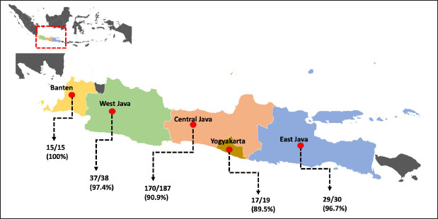 AbstractBackground: Coccidiosis caused by Eimeria species (spp.) is a significant global health concern in goats leading to gastrointestinal illness. This condition causes clinical manifestations, including weight loss and diarrhea, resulting in worldwide economic losses. Subclinical symptoms can manifest during Eimeria infection. Neglecting this disease can lead to severe morbidity and mortality. Therefore, addressing caprine coccidiosis is imperative. Aim: This study aimed to determine the prevalence and molecular identification related to the natural infection of Eimeria spp. in domestic goats originating from Java Island, Indonesia. Methods: In total, fecal samples from 289 domestic goats were obtained across five provinces on Java Island, Indonesia: East Java, Central Java, D. I. Yogyakarta, West Java, and Banten. Morphological examinations were performed using the modified Whitlock method and saturated sugar flotation. Molecular assays targeting the 18S ribosomal ribonucleic acid have been employed for spp.-specific confirmation. Statistical analysis was performed using the Wilson binomial proportion and chi-square methods implemented in the online software. Results: A total of 92.7% (268/289) of fecal samples tested positive for Eimeria spp. Phylogenetic tree analysis demonstrated that Eimeria christenseni and Eimeria arloingi closely resembled the reference sequences from China, Australia, and other countries. Conclusion: This study identified E. christenseni and E. arloingi as the goat-infecting spp. of Eimeria present on Java Island. The specific and accurate molecular identification conducted in this study will contribute to improved coccidiosis control and the development of effectiveness. Keywords: Eimera, Goat, Indonesia, Molecular identification, 18S rRNA. IntroductionSmall ruminants play a significant role in sustainable agriculture in developing countries and provide numerous socioeconomic advantages (Anim-Jnr et al., 2023). Goats are considered one of the most promising sources of meat and dairy production in Indonesia. Indonesia is a tropical country that has a total goat population of around 18.5 million with various local breeds including Peranakan Ettawa, Jawarandu, Saanen, Boer, and Kacang (BPS, 2022). Eimeria spp. are gastrointestinal protozoans belonging to the apicomplexan group (Underwood et al., 2015). These protozoans infect the digestive tract, causing coccidiosis. Coccidiosis has high morbidity and mortality rates as the condition causes impaired nutrient absorption, which results in decreased quality of life and productivity (Engidaw et al., 2015). Several Eimeria species (spp.) have been identified in small ruminants, with those frequently infecting goats including Eimeria caprina, Eimeria ninakohlyakimovae, Eimeria jolchijevi, Eimeria apsheronica, Eimeria christenseni, Eimeria caprovina, Eimeria alijevi, Eimeria hirci, and Eimeria arloingi (Bawm et al., 2020). Among these, E. arloingi, E. ninakohlyakimovae, and E. christenseni are highly pathogenic and are often associated with significant mortality in goats, especially those under one year of age (Khodakaram-Tafti et al., 2013; Roh et al., 2023). Clinical symptoms are insufficient for the diagnosis of coccidiosis. This could be misinterpreted as a clinical manifestation of other intestinal disorders. The diagnosis of coccidiosis typically relies on the morphological characteristics of oocysts, including host specificity, aspects of the life cycle, sites of infection, pathogenicity, antigenicity, nucleotide sequencing, clinical symptoms in the animal, and typical macroscopic lesions at necropsy (Berto et al., 2014). Information on the morphological characteristics of Eimeria in Indonesia remains limited; therefore, the specific Eimeria spp. present in Indonesia remains unclear. When compared, those spp. identified across different regions of other countries have slightly different morphological and structural variations (Gondipon and Malaka, 2021). The identification of different spp. has traditionally relied on the microscopic examination of oocysts, which involves biological assessments, including the size and morphological characteristics of oocysts, absence or presence of residual oocysts, sporulation period, prepatent period, micropyle cap, and site of colonization (Bawm et al., 2020). This method is commonly employed to identify coccidia in goats, particularly in Indonesia (Pamungkas et al., 2021; Pertiwi et al., 2023). However, due to the similar morphological characteristics of some spp., relying on physical traits alone is not sufficient for accurately identifying Eimeria spp. with nearly identical shapes and sizes (morphological resemblance) (Haug et al., 2007). To address this limitation, polymerase chain reaction (PCR) has been used to accurately and rapidly identify Eimeria spp. (Jordan et al., 2018). Molecular assays are considered precise methods for identifying Eimeria spp. due to their high sensitivity and reliability (Al-Habsi et al., 2017). Deoxyribonucleic acid (DNA) sequences are known to be more consistent than morphological characteristics. In the present study, identification and phylogenetic analyses were performed using ribosomal DNA (rDNA). rDNA in eukaryotic cells consists of tandem arrays containing several hundred to thousand repetitions in each arrangement (Hillis and Dixon, 2011). The 18S ribosomal ribonucleic acid (rRNA) gene is frequently utilized as a molecular marker for genetic analysis. Furthermore, 18S rRNA gene sequences have been used to delineate the inter- and intraspecies phylogenetic relationships among various Eimeria isolates (Verma et al., 2017). Despite limited knowledge of the genetic characteristics of Eimeria spp. in small ruminants, molecular biology methods have the potential for appropriate classification. This study aimed to bridge this gap by isolating genomic DNA from purified oocysts in goats, followed by amplification and sequencing of the 18S r