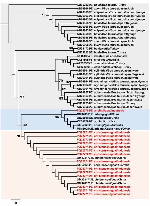 Fig. 3. Maximum likelihood tree of the partial 18S rRNA gene for approximately 650 bp. The phylogenetic tree was generated by Bootstrap 1,000, and the best-fit model K2P+I was chosen according to the Bayesian Information Criterion (BIC). Eimeria bovis was used as an outgroup. Bootstrap values are indicated at each node. DiscussionGoat farming is an important aspect of livestock farming in Indonesia (Tenrisanna and Kasim, 2021). Currently, coccidiosis significantly impacts the production traits of goats, such as milk and meat, leading to substantial economic losses worldwide. This has become a major concern hindering the healthy growth of the goat farming industry and poses a serious threat to the health and productivity of livestock, particularly young goats. Understanding the incidence of Eimeria in a specific region to implement effective control measures and minimize the economic losses associated with the disease is crucial (Ruiz et al., 2012). Sixteen Eimeria spp. have been documented to affect goats globally, although the precise number of valid spp. varies depending on the study (Abo-Shehada and Abo-Farieha, 2003). Currently, the practical method for identifying spp. within goat coccidia is through morphological observation of oocysts (Khodakaram-Tafti et al., 2013). Nonetheless, this approach may prove unreliable due to potential overlap in the quantitative and qualitative morphological characteristics of oocyst between spp. and within spp. of Eimeria. To address the limitations of traditional methods, molecular techniques have recently been demonstrated to be effective in identifying and classifying Eimeria (Matsubayashi et al., 2005; Kawahara et al., 2010; Takeo et al., 2014). Identifying spp. in Eimeria co-infections is difficult because of their morphological similarities, which complicates their differentiation under a microscope. The presence of overlapping life cycle stages complicates identification, as various spp. may exhibit similar characteristics during certain developmental phases. Mixed infections further complicate the evaluation of the contribution of each spp. to the disease severity. These issues underscore the need to integrate multiple diagnostic techniques, including molecular assays, to identify cases of co-infection reliably. In Indonesia, morphological and molecular studies focusing on Eimeria spp. in goats are limited. This study aimed to identify the prevalence and composition of Eimeria spp. causing coccidiosis in domestic goats in Java, Indonesia, using morphological examination and molecular methods with 18S rRNA sequences. This could contribute to the understanding of the biology, molecular epidemiology, and population diversity of goat Eimeria spp. Additionally, the analysis will aid in supporting host adaptation of Eimeria spp. in various animals, including goats, sheep, and cattle. This study revealed that two Eimeria spp. have adapted to goats in different provinces across Java Island. The two different spp. suggests that Eimeria responds to regional immune systems and farming practices. High infection rates may favor organisms with enhanced infection or treatment resistance. The analysis of fecal samples using saturated sugar flotation and Whitlock techniques has enabled the detection and measurement of Eimeria oocysts. These methods are widely used because of their ease and reliability in identifying coccidian infections (Khodakaram-Tafti et al., 2013). Our study identified suspected cases of E. christenseni and E. arloingi, which are known to have high pathogenicity and are often fatal to goats, especially those under one year of age (Roh et al., 2023). The sporulation process of Eimeria oocysts in potassium dichromate facilitates morphological characterization and spp. identification (Gong et al., 2021). Mature sporulated oocysts were subjected to microscopic examination, where morphological features including shape, size, and the presence of specific structures such as the micropyle and polar cap were evaluated (Stotish et al., 1978). Based on these characteristics, E. christenseni and E. arloingi were identified and their morphological differences were noted. The current study demonstrated a moderately high prevalence of Eimeria spp. in goats (92.7%, 268/289) on Java Island, Indonesia, with varying prevalence rates in each province. Certain regions exhibit higher prevalence rates than those noted in others. Confidence intervals estimate the precision of the proportion of positive samples at each location. The prevalence of E. christenseni and E. arloingi is widely recognized as the most pathogenic coccidia spp. affecting goats globally (Roh et al., 2023). A morphological study using microscopic examination of goats in the arid tropical regions of Africa, such as Kenya (Kanyari et al., 2009), Somalia (Harmaya et al., 2020), and Nigeria, revealed a significant prevalence of Eimeria spp. infections. Notably, E. christenseni (60%) and E. arloingi (64%–80%) were identified as the most prevalent spp. Comparative research from Asian countries, such as Vietnam, India, Myanmar, and China, also demonstrated a low to a high prevalence of E. christenseni (63%–78%) and E. arloingi (21%–73%) (Bawm et al., 2020; De et al., 2021; Diao et al., 2022; Nguyen-Ho-Bao et al., 2022). The absence of statistically significant differences in coccidia infection rates between the two variables (sex and breed) suggests that infection may occur in goats indiscriminately based on these factors. In terms of sex, females (93.56%) had a non-significantly higher infection rate than the rate in males (91.52%). Similar results for the prevalence of Eimeria spp. infection between sexes have been reported previously by Dabasa et al. (2017) attributing to the similar management systems used to maintain both sexes, which provides an equal likelihood of infection. The animals in this study demonstrated a non-significant difference in the prevalence of Eimeria spp. Infections