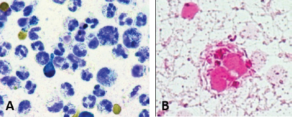 Fig. 2. Skin cytology in case 1. (A) Wright-Giemsa stain and (B) Gram stain revealing a marked inflammatory response consisting of non-degenerative and degenerative neutrophils and macrophages, with moderate to abundant numbers of intracellular (neutrophils and macrophages) and extracellular rods. Treatment approach and outcomeWe assessed the antimicrobial susceptibility after diagnosis by the broth microdilution method (He et al., 2016) (MicroScan WalkAway Plus System, Beckman Coulter, Inc., Brea, CA.) according to the Clinical & Laboratory Standards Institute guidelines (M100-S26). The treatment approach and outcomes for the two dogs are summarized in Table 2. In case 1, the first to third treatment protocols were performed in a primary hospital. Unfortunately, the primary doctor judged the microbiological report as contamination because of unawareness about Bcc and provided the treatment for Pseudomonas aeruginosa-related deep pyoderma. Case 1 did not achieve remission for approximately 66 weeks even with seven protocols, whereas it took only 3 weeks to achieve remission in case 2. Ciclosporin and prednisolone were stopped immediately in case 2 after diagnosis with Bcc infection; however, it was challenging to stop the regimen in case 1 because of IMPA recurrence and onset of iatrogenic hypoadrenocorticism. Case 1 was treated with topical therapy and general antibiotic administration. Antibiotics were selected based on susceptibility testing, and the treatment regimen included enrofloxacin, minocycline, sulfamethoxazole-trimethoprim, and chloramphenicol, but all these medications led to multiple relapses during treatment. Finally, ciclosporin was withdrawn, and imipenem-cilastatin was administered in the hospital for 10 days, after which remission was achieved. Table 2. Treatment approach and outcome in two dogs with Bcc-related deep pyoderma.