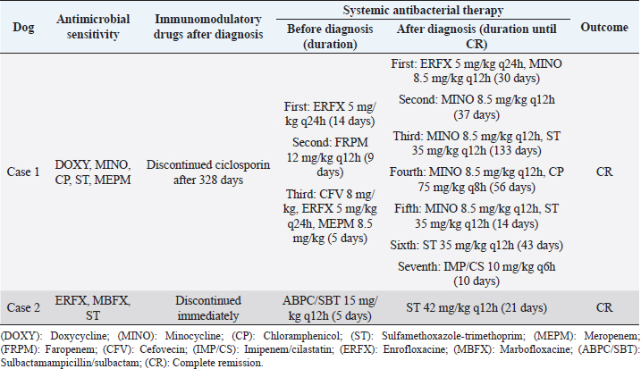 AbstractBackground: The Burkholderia cepacia complex (Bcc) is an opportunistic pathogen in humans and animals. Deep pyoderma caused by these bacteria in dogs has been previously reported. This case series aims to describe contrasting treatment responses in Bcc-related deep pyoderma in two dogs, a male and a female. Case Description: Both patients had a history of immune-mediated polyarthritis (IMPA) managed with oral ciclosporin and prednisolone. Their skin lesions were multifocal, irregular, erythematous to hemorrhagic, alopecic papules, plaques, and nodules, with extensive crusting, draining tracts, and ulceration. Cytological findings revealed a marked inflammatory response consisting of non-degenerative and degenerative neutrophils and macrophages, with moderate to abundant intracellular and extracellular Bcc. Ciclosporin and prednisolone were stopped in case 2 after diagnosis. However, it was challenging to stop the regimen in case 1 because of the recurrence of IMPA and the onset of iatrogenic hypoadrenocorticism. Case 1 did not achieve remission for approximately 66 weeks even with seven protocols because of multiple relapses, whereas it took only 3 weeks to achieve remission in case 2 while using one drug. Conclusion: For deep pyoderma with extensive lesions in immunosuppressed patients, one should consider infection with Bcc. Therefore, immunosuppressants should promptly be reduced in such patients, and then, intensive antimicrobial therapy may achieve remission. Keywords: Burkholderia cepacia complex, Deep pyoderma, Immunosuppressant, Dogs. IntroductionThe Burkholderia cepacia complex (Bcc) represents a group of motile, aerobic, glucose-nonfermenting gram-negative rods. These bacteria are ubiquitous in the natural environment and can be isolated from water, soil, fruits, and vegetables (Compant et al., 2008). Bcc organisms have emerged as important opportunistic pathogens in hospitalized (i.e., nosocomial infection) and immunocompromised patients and have been associated with contaminated disinfectants, hospital tap water, intravenous solutions, and medical devices (Nasser et al., 2004). In previous reports, Bcc-related deep pyoderma in dogs was successfully treated in a relatively short period with antimicrobials (Banovic et al., 2015; Cain et al., 2018). The objective of this case series is to describe different treatment responses in Bcc-related deep pyoderma in two dogs. Case DetailsThe signs and historical data of the two dogs are summarized in Table 1. Patient 1 was a castrated male, and patient 2 was a spayed female. Both patients had a history of immune-mediated polyarthritis (IMPA) managed with oral ciclosporin and prednisolone. Both dogs developed skin lesions within 4–5 months of starting ciclosporin. Skin lesions were initially dorsally distributed in both dogs, particularly in the buttocks area in case 1. These lesions were multifocal, irregular, erythematous to hemorrhagic, alopecic papules, plaques, and nodules, with extensive crusting, draining tracts, and ulceration (Fig. 1). Skin cytology in both dogs revealed a marked inflammatory response consisting of non-degenerative and degenerative neutrophils and macrophages, with moderate to abundant numbers of intracellular (neutrophils and macrophages) and extracellular rods (Fig. 2). These rod-shaped bacteria were identified as Bcc in a diagnostic laboratory. We axenically collected culture samples from non-ruptured comedones by fine-needle aspiration. After isolation and culturing with the rod-shaped bacteria, these samples were examined by a Matrix-assisted laser desorption/ionization-time of flight mass spectrometry imaging technique (MALDI Biotyper System, Bruker Corporation, Billerica, MA) in a commercial diagnostic laboratory (Sanritsu Zelkova, Chiba, Japan). As these mass spectrometry data matched B. cepacia, we diagnosed Bcc-related deep pyoderma. Table 1. Signalment and historical features of two dogs with Bcc-related deep pyoderma.
