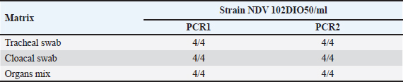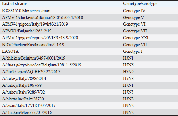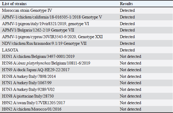 The detection limit was determined for individual samples and up to five pooled samples for each matrix. Preparations of a pool of five at the detection limit For each type of analytical matrix, we diluted the NDV 108 DIO50/ml strain 10-fold in Phosphate-Buffered Saline (PBS) supernatant of negative samples to obtain a suspension at the previously determined detection limit. Then, we further diluted this suspension1/5 in PBS supernatant of negative samples and processed it as described above. Intra-y and inter-assay repeatabilityThe CV was calculated by dividing the standard deviations of the samples by the mean of the cycle threshold values and multiplying the result by 100 to estimate the inter-assay and intra-assay repeatability. CVs below 10% were considered satisfactory (Vandemeulebroucke et al., 2010). Results Analytical specificityThe experimental analytical specificity of the ID Gene™ Newcastle Disease Duplex kit was verified in terms of inclusivity and exclusivity. All selected NDV strains were scored positive regardless of their genotype, confirming that the ID Gene™ Newcastle Disease Duplex kit allows the detection of Moroccan NDV strains, as well as other NDV genotypes. Samples of other orthomyxoviruses were negative at PCR, excluding cross-reactivity with highly pathogenic avian orthomyxoviruses, such as influenza A virus subtypes H5 and H7 (Table 2). Analytical sensitivityLimit detection to be checked The analytical sensitivity was determined for each type of matrix (tracheal swab, cloacal swab, and tissues) and for the extraction method (NucleoSpin® RNA Virus, Macherey-Nagel). For this purpose, pools of PBS supernatants of each type of matrix were formed. We performed extractions using the extraction kit with 150 µl of each dilution of Strain NDV 10 DIO50/ml to Strain NDV 107 DIO50/ml, adding exogenous Non-target positive control (NTPC) from the ID Gene™ Newcastle Disease Duplex kit. After assessing several NDV dilutions, the analytical sensitivity was checked for each matrix and for each extraction method, as the last dilution point at which a positive Reverse Transcription Polymerase Chain Reaction (RT-PCR) result was obtained, was 102 and 103 IOD50/ml for individual and pooled samples of five, respectively. Limit of detection for individual samples With the NucleoSpin® RNA Virus kit (Macherey-Nagel), the validated limit detection method for individual samples was “NDV 102 DIO50/ml” for tracheal and cloacal swabs, as well as for organs (Table 3). Limit detection in pools of five samples With the NucleoSpin® RNA Virus kit, MachereyNagel, the validated “LDMethod for pools is “NDV 102 DIO50/ml” for tracheal and cloacal swabs, as well as for organs (Table 4). Intra-assay and inter-assay repeatabilityThe intra-assay repeatability was between 2% and 4% and 1% for 102 and 103 DIO50/ml, respectively. The inter-assay repeatability was 3% and 1% for 102 and 103 DIO50/ml, respectively. The results are considered satisfactory. Table 2. Strains used to test inclusivity and exclusivity.