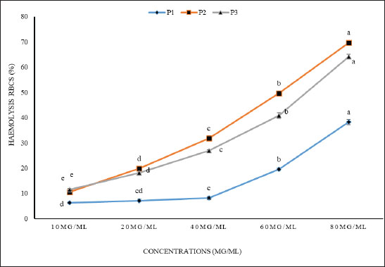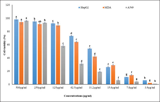 Fig. 1. The hemolytic effect of various concentrations (10, 20, 40, 60, and 80 μg/ml) of P1, P2, and P3 propolis samples on human RBC cell activity is investigated. Different letters in each row indicate statistically significant differences at p < 0.05. The substantially lower hemolysis observed with P1 suggests its potential superiority in mitigating oxidative stress or membrane destabilization, which are common causes of hemolysis in RBCs. This effect might stem from a higher concentration or more potent activity of bioactive compounds present in P1, which enhance erythrocyte membrane stability or act as free radical scavengers. The extracts’ inhibitory concentrations (IC50), the point at which 50% hemolysis occurred, were also notably different among the samples, with values at 104.6 µg/ml for P1, 60.5 µg/ml for P2, and 73.5 µg/ml for P3. The higher IC50 value for P1 corroborates its cytoprotective potential, implying that it requires a greater concentration to induce hemolysis compared to P2 and P3. The differences in IC50 values among the samples reflect the varied composition of propolis from different geographical or botanical origins, affecting their cytotoxic profiles. This variation in bioactivity is a critical consideration in evaluating the therapeutic applications of propolis extracts, particularly in formulations aimed at minimizing cytotoxic effects while maintaining efficacy. Overall, the northern propolis extract demonstrates a promising profile for applications necessitating reduced cytotoxicity, reinforcing its potential benefits, particularly in therapeutic environments where cell viability is paramount. Anticancer activityThe anticancer efficacy of the P1 propolis extract was evaluated based on the antioxidant and cytotoxicity data presented in Table 3 and Figure 2. This analysis focused on its impact on three carcinoma cell lines: HepG2 (liver carcinoma), MDA (breast carcinoma), and A549 (lung carcinoma). The findings, illustrated in Figure 2, highlighted the efficacy of the P1 sample, with distinct concentration-dependent effects on cell viability observed across the cell lines. At a concentration of 500 µg/ml, the P1 extract achieved the highest cell viability among the HepG2, MDA, and A549 cell lines, while the lowest cell viability was recorded at 3.9 µg/ml. Notably, the A549 cell line consistently exhibited the lowest cell viability across most treatments, with the exception being the higher concentrations of 500 and 250 µg/ml, where it showed comparatively better resilience than the MDA line. Conversely, the HepG2 cell line demonstrated the highest viability across all concentration treatments, except at 15.6 and 7.8 µg/ml, where the response was less favorable than MDA. These results underline the importance of concentration in determining the cytotoxic potential of P1, emphasizing the variability in response among different carcinoma types.