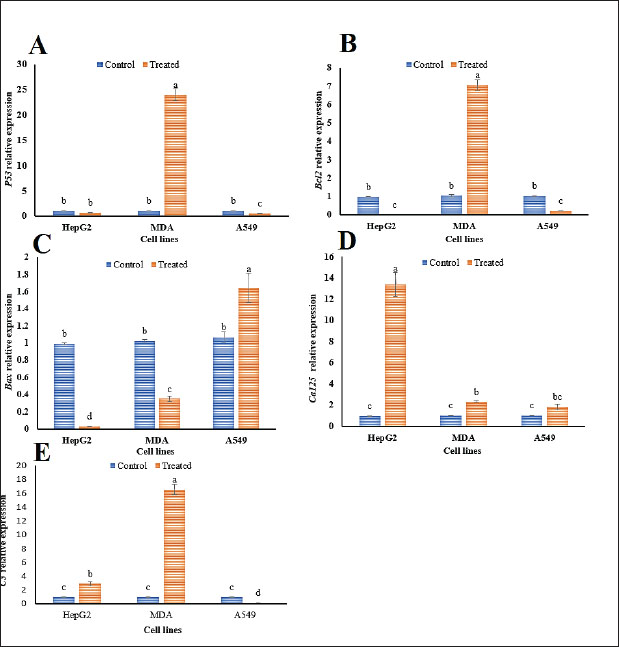Fig. 2. The anticancer effect of various concentrations (500, 250, 125, 62.5, 31.2, 15.6, 7.8, and 3.9 μg/ml) of Propolis 1 (P1) extract on HepG2, MDA, and A549 carcinoma cell lines. Different letters in each row signify statistically significant differences at p < 0.05. The pronounced concentration-dependent responses observed, particularly in the A549 and MDA cell lines at higher concentrations, suggest a therapeutic window where anticancer efficacy could be maximized while mitigating adverse impacts on non-cancerous cells. This potential for targeted therapy is further underscored by the HepG2 cell line’s unique viability patterns at specific concentrations, indicating that individual carcinoma types may require tailored treatment regimens to optimize therapeutic outcomes. These findings highlight the importance of understanding the nuanced interactions between propolis extract concentrations and cancer cell viability. The distinct behavior seen in each cell line stresses the need for personalized approaches in anticancer treatments, considering the specific vulnerabilities and resistance profiles of different carcinoma cells. This comprehensive assessment of P1’s anticancer activity offers valuable insights into its potential as a versatile and effective therapeutic agent. qRT-PCRqRT-PCR was used to investigate the transcriptional responses of five critical immune-related genes (P53, Bcl2, Bax, Ca125, and C3) in three carcinoma cell lines: HepG2, MDA, and A549 following treatment with the P1 propolis extract compared to untreated controls. As demonstrated in Figure 3, P53 gene exhibited a substantial increase in expression in MDA cells, showing a 23.29-fold elevation under the influence of P1 treatment. This upregulation indicates a potential mechanism by which P1 induces apoptosis or cell cycle arrest, reflecting its role in tumor suppression. In contrast, P53 expression was significantly reduced in A549 cells, suggesting a differential response that could be influenced by the unique genetic makeup or stress-resilience pathways intrinsic to these cells (Fig. 3A). The Bcl2 gene, known for its role in inhibiting apoptosis, exhibited a similar trend to P53, with a 6.73-fold increase in MDA cells, potentially contributing to cell survival and proliferation in these cells under P1 treatment. Meanwhile, Bcl2 expression was suppressed in both HepG2 and A549 cells, aligning with an enhanced apoptotic response in these lines (Fig. 3B). The Bax gene, a pro-apoptotic marker, was notably upregulated in A549 cells with a 1.53-fold change, suggesting a boosted apoptotic pathway activation, which might counteract the reduced P53 expression (Fig. 3C). This implies a complex interaction where Bax-mediated apoptosis might still proceed effectively despite modifications in P53 regulation. Ca125 expression increased significantly across all cell lines, with the HepG2 line experiencing a remarkable 13.53-fold change. This upregulation might be linked to the cellular stress response or altered cell adhesion and migration properties associated with cancer progression (Fig. 3D). For the C3 gene, an essential component of the complement system, expression was prominently induced in HepG2 (2.84-fold change) and MDA (16.38-fold change) cells, highlighting an enhanced immune response or a heightened state of inflammation under P1 treatment. A549 cells, however, showed decreased C3 expression, which may reflect an evasion of immune-mediated cell death or a modified inflammatory environment (Fig. 3E). These differential gene expression patterns underscore the complex, cell-specific responses to P1 treatment, illustrating the potential for tailored therapeutic strategies that harness gene-specific modulation. The distinct behaviors of each gene across the cell lines provide valuable insights into the molecular mechanisms governing P1’s anticancer effects, which could inform the development of targeted cancer therapies. DiscussionAs chronic diseases continue to rise and global health faces threats from increasing rates of antibiotic resistance among microbes, particularly infectious bacteria, extensive research has been undertaken to explore natural products and their constituents as alternative therapies to conventional chemical approaches for chronic diseases (Docquier and Mangani, 2018). Propolis, a complex mixture of phytoconstituents with a resinous texture produced by honeybees from plant resins, has been used since ancient times for various purposes and has gained recognition in pharmaceutical applications in recent years (Chavda et al., 2023). The chemical composition of propolis varies based on factors, such as honeybee species, plant sources used, climate conditions, and harvesting seasons (Barsola and Kumari, 2022). Our results revealed a rich content of antioxidants and secondary metabolites in propolis, aligning with previous findings (Chavda et al., 2023). Given the growing interest in antioxidants among health and medical researchers, the abundance of antioxidants in propolis is noteworthy. Additionally, the presence of saponins and tannins in propolis, known antioxidant compounds, suggests its potential as an effective antibacterial agent. Saponins are recognized for their antimicrobial properties and role in protective mediation against potential illnesses (Ghafar et al., 2010). Tannins, as secondary metabolites, function as powerful biological antioxidants, playing a crucial role in defending against oxidative damage (Kehrer, 1993).