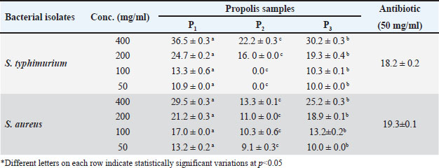 Table 2. The effect of different concentrations (400, 200, 100, and 50 mg/ml) of three propolis samples (P1, P2, and P3) on inhibition growth (mm) of different human bacterial isolates (S. typhimurium, and S. aureus) compared to antibiotic effect.