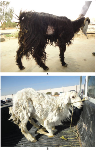 Fig. 1. Clinical presentation of a goat and a sheep with paratuberculosis. The goat (A) was presented with a history of chronic watery diarrhea, while the sheep (B) was presented without a history of diarrhea. Small ruminants are usually infected during the first week of age, but infection can occur at any age (Idris et al., 2021). The disease is typically observed in sheep and goats between the ages of 2–4 years old, and the symptoms are sometimes observed in dams immediately following parturition (Clarke, 1997) as stress may enhance the appearance of the clinical form. A remarkable decrease in body weight is the dominant sign in infected ovine and caprine. Other findings may include anorexia, coat roughness, and depression (Bauman et al., 2016). As the disease progresses, infected animals become more emaciated, dehydrated, anemic, depressed, and the skin appears fragile with submandibular edema (Djønne, 2010). Hematobiochemical changesIn goats with PTB, hematological changes included neutropenia, leukocytosis, erythrocytosis, increased hematocrit percent and hemoglobin concentration, and increased erythrocyte indexes, mean corpuscular hemoglobin, and mean corpuscular volume. Serum changes included hypocalcemia, hypoalbuminemia, and hypomagnesemia increased activity of creatine kinase (Tharwat et al., 2012b). Intermandibular edema, hypoproteinemia, and hypocalcemia have also been found in sheep with clinical forms of PTB (Jones, 1996). Ultrasonographic findingsUltrasonography has been proven effective for the early detection of several abdominal and thoracic disorders in small ruminants (Tharwat et al., 2012b; Tharwat and Al-Sobayil, 2017; Tharwat, 2021; Sadan et al., 2023; Tharwat and Al-Hawas, 2024a,b; Tharwat et al., 2024; Tharwat et al., 2025b). Recently, the technique has been found valuable for the diagnosis of various bacterial and parasitic infections in ruminants (Tharwat and Tsuka, 2024). An overall increase in intestinal mucosa thickness was detected in goats with PTB. It was classified as either mild, moderate, or severe (Fig. 2). Corrugation and folding of the intestinal mucosa may be also imaged in goats with PTB (Fig. 3). However, remarkable enlargement of the mesenteric lymph nodes are the most important findings in goats with PTB (Fig. 4). Other sonographic changes included increased hepatic brightness, intestinal edema consolidated lungs, and pleural, peritoneal, and pericardial effusions (Tharwat et al., 2012b). Pathological findingsIn sheep, reported postmortem findings included thickened intestinal walls, folding and corrugation of intestinal mucosa especially close to the ileocecal junction (Sikandar et al., 2013; Srikanth et al., 2017). Cecal and colonic changes are moderate compared to the terminal ileum (Carrigan and Seaman, 1990; Stehman, 1996). Edematous and enlarged ileocecal and mesenteric lymph nodes may be observed (Coelho et al., 2018). Histopathologically, granulomatous enteritis accompanied by severe cellular infiltrate consisting mainly of lymphocyte, epithelioid, and giant cells and macrophages with acid-fast organisms are detected (Hamid et al., 2018). Peyer’s patches hyperplasia, necrosis, and villous atrophy were also reported. Histopathology of enlarged lymph nodes included macrophages and epithelioid cell infiltration with acid-fast MAP bacilli with occasional foci of caseous necrosis and giant cells (Coelho et al., 2018).