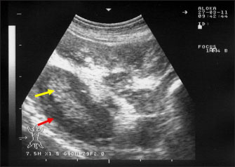 Fig. 4. Ultrasonography of the enlarged mesenteric lymph nodes in a goat with paratuberculosis. The enlarged lymph node showed a hypoechoic cortex (red arrow) and a hyperechoic medulla (yellow arrow).